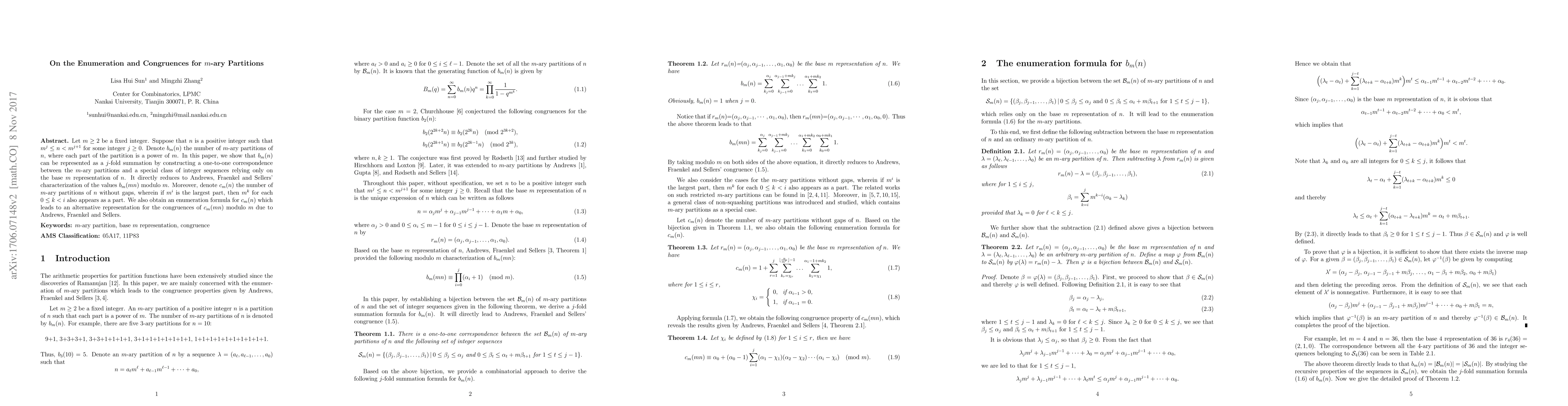 This paper enumerates $m$-ary partitions of integers $n$ where each part is a power of $m$, and establishes a $j$-fold summation representation for $b_m(n)$. It also introduces $c_m(n)$, the count of $m$-ary partitions without gaps, and provides an alternative congruence result for $c_m(mn)$ based on the base $m$ representation of $n$.