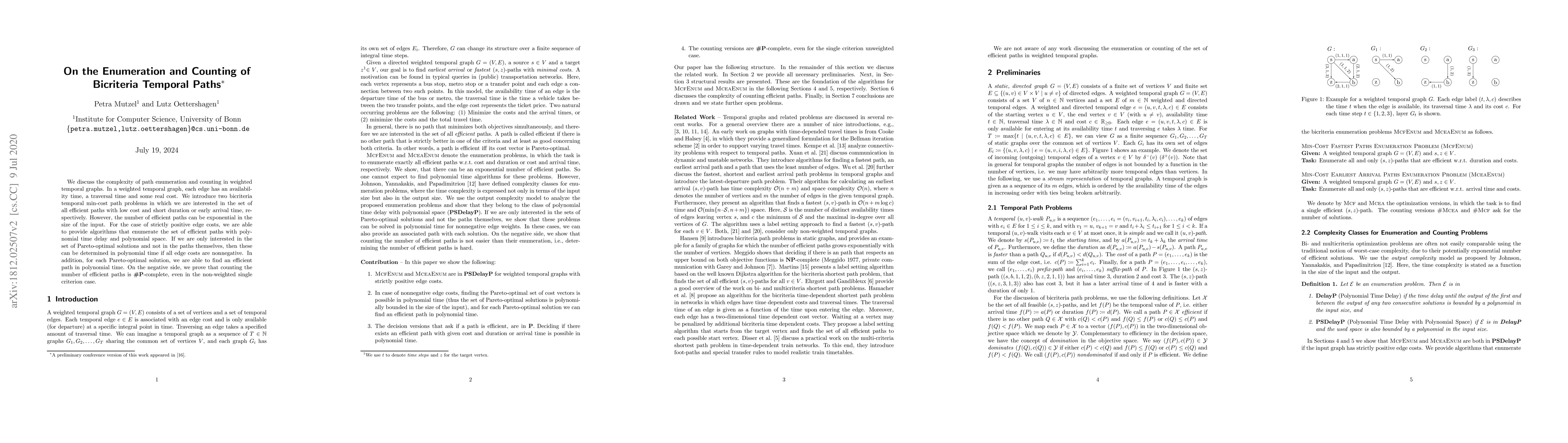 This paper investigates the complexity of enumerating and counting paths in weighted temporal graphs, focusing on bicriteria temporal min-cost problems. It provides polynomial time delay algorithms for enumerating efficient paths and proves #P-completeness for counting these paths, even without weights.