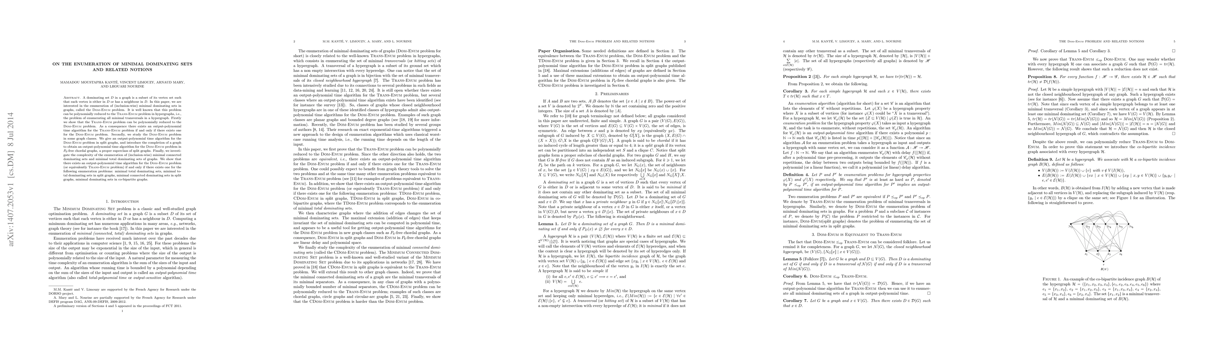 The paper investigates the enumeration of minimal dominating sets in graphs, reducing the Dom-Enum problem to the Trans-Enum problem in hypergraphs and vice versa, establishing equivalence between the two. It provides output-polynomial time algorithms for Dom-Enum in split graphs and $P_6$-free chordal graphs, and relates Dom-Enum to enumeration problems of total dominating sets and connected dominating sets.