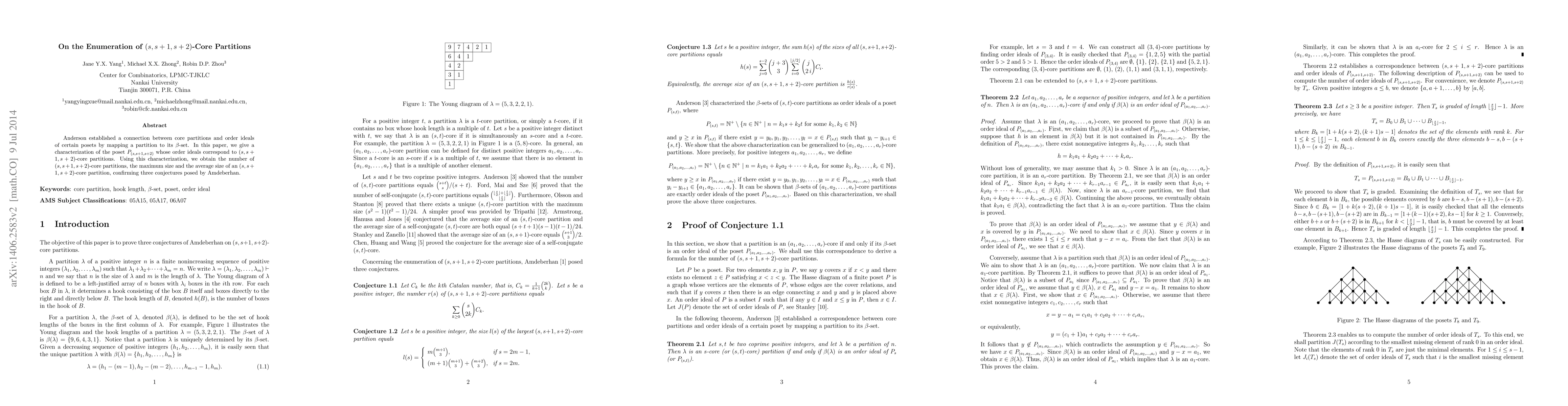 This paper characterizes the poset $P_{(s,s+1,s+2)}$ whose order ideals correspond to $(s,s+1,s+2)$-core partitions and enumerates these core partitions, determining their maximum size and average size, thus confirming three conjectures by Amdeberhan.