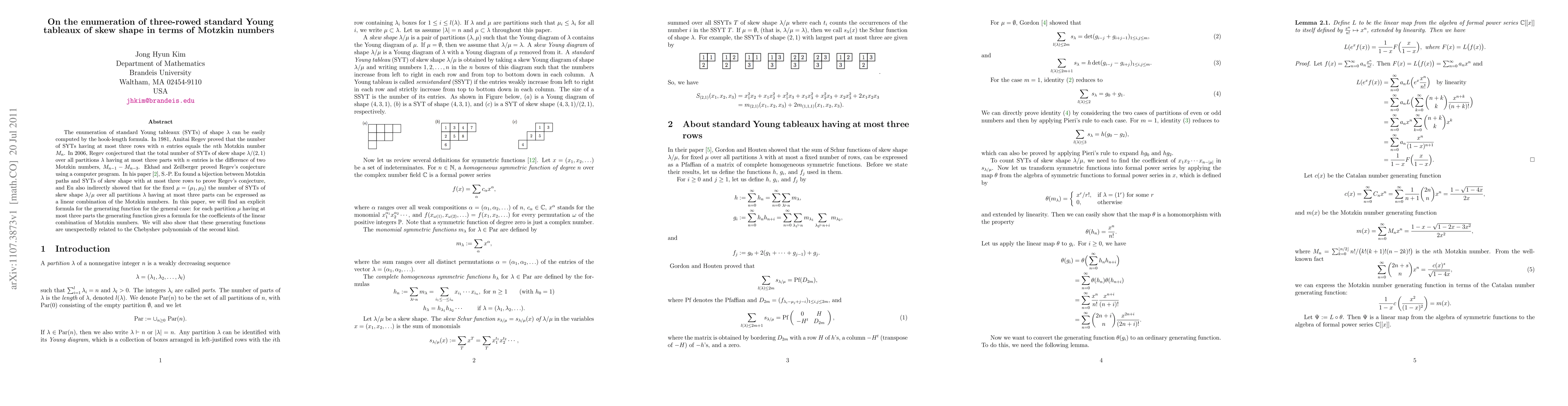 This paper develops an explicit generating function for enumerating three-rowed standard Young tableaux of skew shape in terms of Motzkin numbers, proving a conjecture by Regev and showing a surprising connection to Chebyshev polynomials of the second kind.