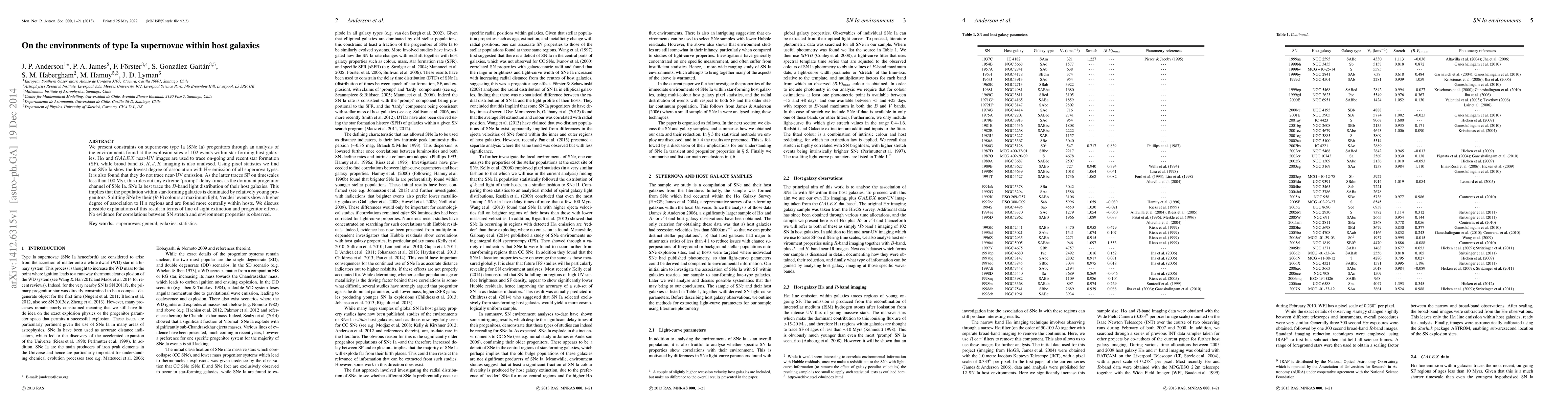 A study of 102 type Ia supernovae found that they show no association with ongoing star formation and instead trace the light distribution of their host galaxies, suggesting young progenitors. Redder events are more closely tied to HII regions and central regions within hosts.