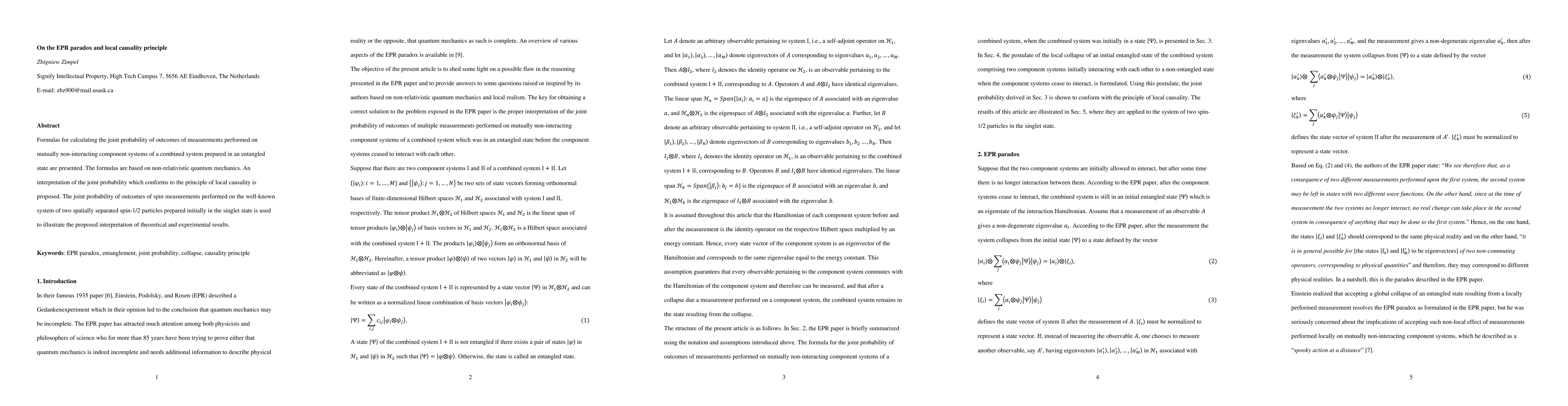 Formulas for calculating the joint probability of outcomes of measurements performed on mutually non-interacting component systems of a combined system prepared in an entangled state are presented. The formulas are based on non-relativistic quantum mechanics. An interpretation of the joint probability which conforms to the principle of local causality is proposed. The joint probability of outcomes of spin measurements performed on the well-known system of two spatially separated spin-1/2 particles prepared initially in the singlet state is used to illustrate the proposed interpretation of theoretical and experimental results.