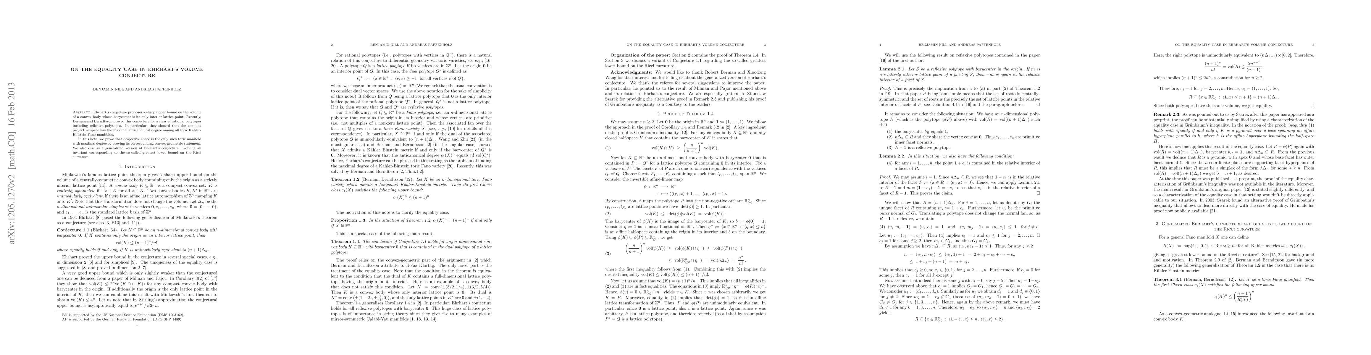 Ehrhart's conjecture proposes a sharp upper bound on the volume of a convex body whose barycenter is its only interior lattice point. Recently, Berman and Berndtsson proved this conjecture for a class of rational polytopes including reflexive polytopes. In particular, they showed that the complex projective space has the maximal anticanonical degree among all toric Kaehler-Einstein Fano manifolds. In this note, we prove that projective space is the only such toric manifold with maximal degree by proving its corresponding convex-geometric statement. We also discuss a generalized version of Ehrhart's conjecture involving an invariant corresponding to the so-called greatest lower bound on the Ricci curvature.