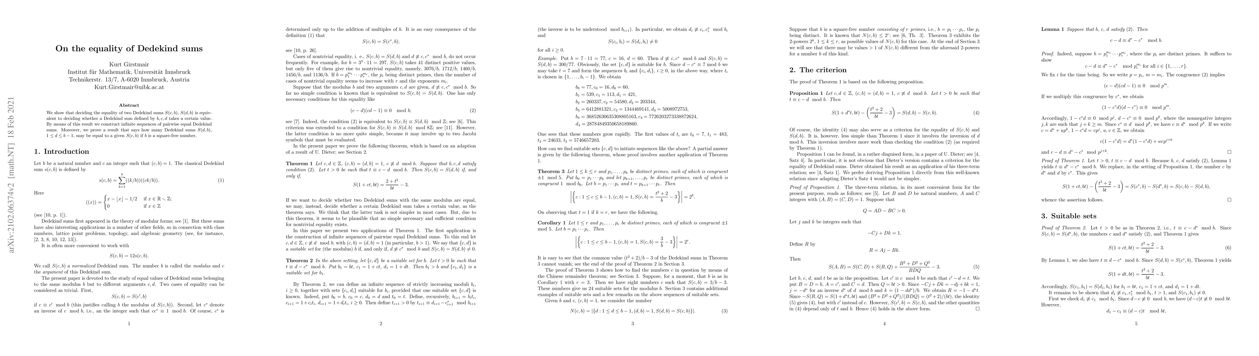 This paper demonstrates that determining if two Dedekind sums $S(c,b)$ and $S(d,b)$ are equal is equivalent to checking if a specific value arises from a Dedekind sum defined by $b, c,$ and $d$. It also constructs infinite sequences where multiple Dedekind sums are equal and determines the number of such sums relative to a given $S(c,b)$ when $b$ is square-free.