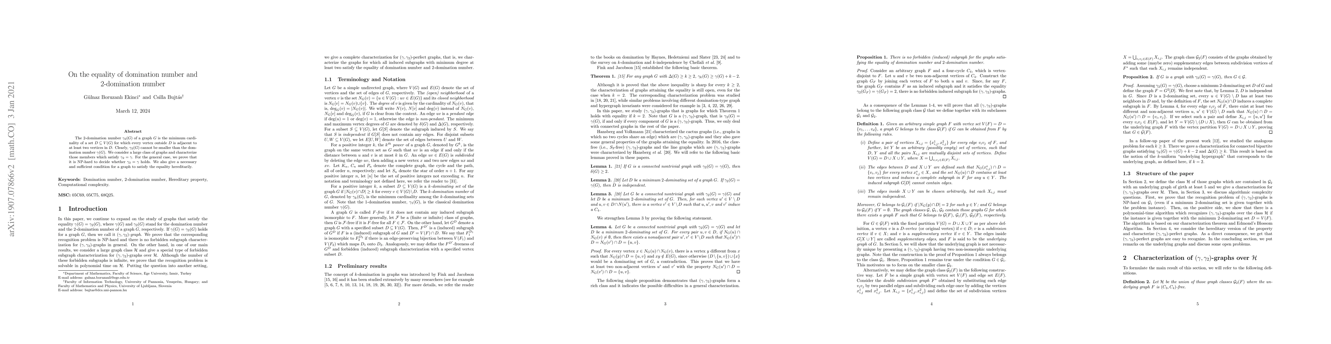 This paper investigates the relationship between the domination number $\gamma(G)$ and the 2-domination number $\gamma_2(G)$ of graphs, identifying a large class where $\gamma_2 = \gamma$. It proves the problem of determining whether $\gamma_2 = \gamma$ is NP-hard in general and provides a necessary and sufficient condition for hereditary equality.
