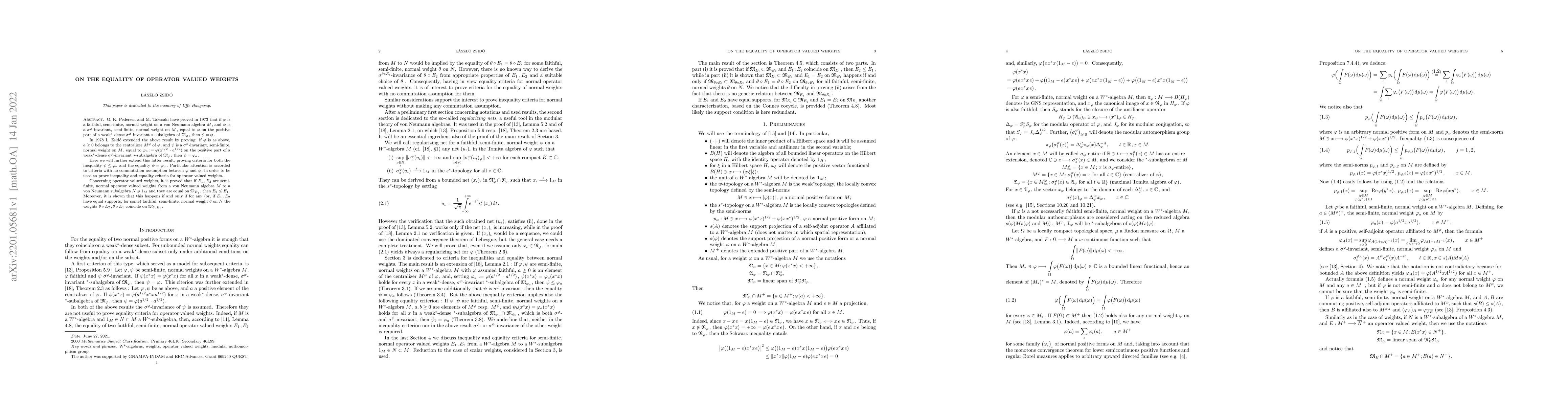 G. K. Pedersen and M. Takesaki have proved in 1973 that if $\varphi$ is a faithful, semi-finite, normal weight on a von Neumann algebra $M\;\!$, and $\psi$ is a $\sigma^{\varphi}$-invariant, semi-finite, normal weight on $M\;\!$, equal to $\varphi$ on the positive part of a weak${}^*$-dense $\sigma^{\varphi}$-invariant $*$-subalgebra of $\mathfrak{M}_{\varphi}\;\!$, then $\psi =\varphi\;\!$. In 1978 L. Zsid\'o extended the above result by proving: if $\varphi$ is as above, $a\geq 0$ belongs to the centralizer $M^{\varphi}$ of $\varphi\;\!$, and $\psi$ is a $\sigma^{\varphi}$-invariant, semi-finite, normal weight on $M\;\!$, equal to $\varphi_a:=\varphi (a^{1/2}\;\!\cdot\;\! a^{1/2})$ on the positive part of a weak${}^*$-dense $\sigma^{\varphi}$-invariant $*$-subalgebra of $\mathfrak{M}_{\varphi}\;\!$, then $\psi =\varphi_a\;\!$. Here we will further extend this latter result, proving criteria for both the inequality $\psi \leq\varphi_a$ and the equality $\psi =\varphi_a\;\!$. Particular attention is accorded to criteria with no commutation assumption between $\varphi$ and $\psi\;\!$, in order to be used to prove inequality and equality criteria for operator valued weights. Concerning operator valued weights, it is proved that if $E_1\;\! ,E_2$ are semi-finite, normal operator valued weights from a von Neumann algebra $M$ to a von Neumann subalgebra $N\ni 1_M$ and they are equal on $\mathfrak{M}_{E_1}\;\!$, then $E_2\leq E_1\;\!$. Moreover, it is shown that this happens if and only if for any (or, if $E_1\;\! ,E_2$ have equal supports, for some) faithful, semi-finite, normal weight $\theta$ on $N$ the weights $\theta\circ E_2\;\! ,\theta\circ E_1$ coincide on $\mathfrak{M}_{\theta\circ E_1}\;\!$.