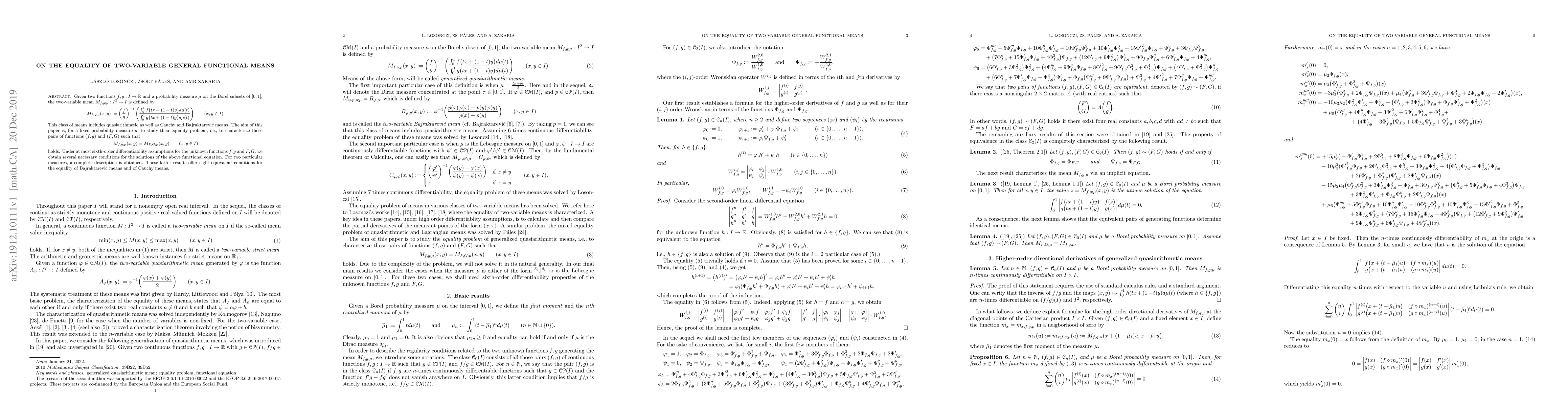 Given two functions $f,g:I\to\mathbf{R}$ and a probability measure $\mu$ on the Borel subsets of $[0,1]$, the two-variable mean $M_{f,g;\mu}:I^2\to I$ is defined by $$ M_{f,g;\mu}(x,y) :=\bigg(\frac{f}{g}\bigg)^{-1}\left( \frac{\int_0^1 f\big(tx+(1-t)y\big)d\mu(t)} {\int_0^1 g\big(tx+(1-t)y\big)d\mu(t)}\right) \qquad(x,y\in I). $$ This class of means includes quasiarithmetic as well as Cauchy and Bajraktarevi\'c means. The aim of this paper is, for a fixed probability measure $\mu$, to study their equality problem, i.e., to characterize those pairs of functions $(f,g)$ and $(F,G)$ such that $$ M_{f,g;\mu}(x,y)=M_{F,G;\mu}(x,y) \qquad(x,y\in I) $$ holds. Under at most sixth-order differentiability assumptions for the unknown functions $f,g$ and $F,G$, we obtain several necessary conditions for the solutions of the above functional equation. For two particular measures, a complete description is obtained. These latter results offer eight equivalent conditions for the equality of Bajraktarevi\'c means and of Cauchy means.