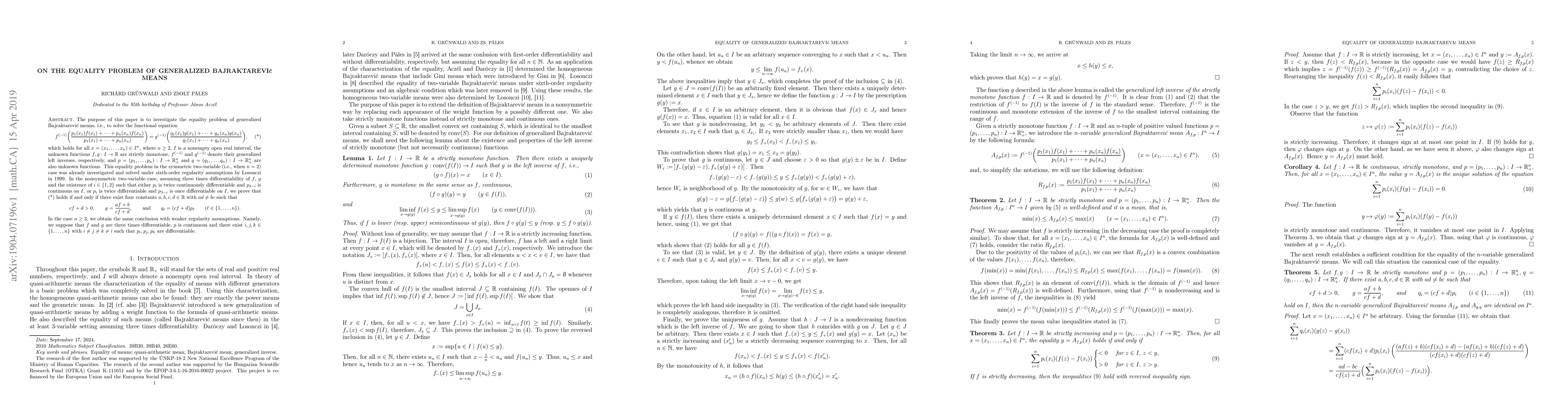The purpose of this paper is to investigate the equality problem of generalized Bajraktarevi\'c means, i.e., to solve the functional equation \begin{equation}\label{E0}\tag{*} f^{(-1)}\bigg(\frac{p_1(x_1)f(x_1)+\dots+p_n(x_n)f(x_n)}{p_1(x_1)+\dots+p_n(x_n)}\bigg)=g^{(-1)}\bigg(\frac{q_1(x_1)g(x_1)+\dots+q_n(x_n)g(x_n)}{q_1(x_1)+\dots+q_n(x_n)}\bigg), \end{equation} which holds for all $x=(x_1,\dots,x_n)\in I^n$, where $n\geq 2$, $I$ is a nonempty open real interval, the unknown functions $f,g:I\to\mathbb{R}$ are strictly monotone, $f^{(-1)}$ and $g^{(-1)}$ denote their generalized left inverses, respectively, and $p=(p_1,\dots,p_n):I\to\mathbb{R}_{+}^n$ and $q=(q_1,\dots,q_n):I\to\mathbb{R}_{+}^n$ are also unknown functions. This equality problem in the symmetric two-variable (i.e., when $n=2$) case was already investigated and solved under sixth-order regularity assumptions by Losonczi in 1999. In the nonsymmetric two-variable case, assuming three times differentiability of $f$, $g$ and the existence of $i\in\{1,2\}$ such that either $p_i$ is twice continuously differentiable and $p_{3-i}$ is continuous on $I$, or $p_i$ is twice differentiable and $p_{3-i}$ is once differentiable on $I$, we prove that \eqref{E0} holds if and only if there exist four constants $a,b,c,d\in\mathbb{R}$ with $ad\neq bc$ such that \begin{equation*} cf+d>0,\qquad g=\frac{af+b}{cf+d},\qquad\mbox{and}\qquad q_\ell=(cf+d)p_\ell\qquad (\ell\in\{1,\dots,n\}). \end{equation*} In the case $n\geq 3$, we obtain the same conclusion with weaker regularity assumptions. Namely, we suppose that $f$ and $g$ are three times differentiable, $p$ is continuous and there exist $i,j,k\in\{1,\dots,n\}$ with $i\neq j\neq k\neq i$ such that $p_i,p_j,p_k$ are differentiable.