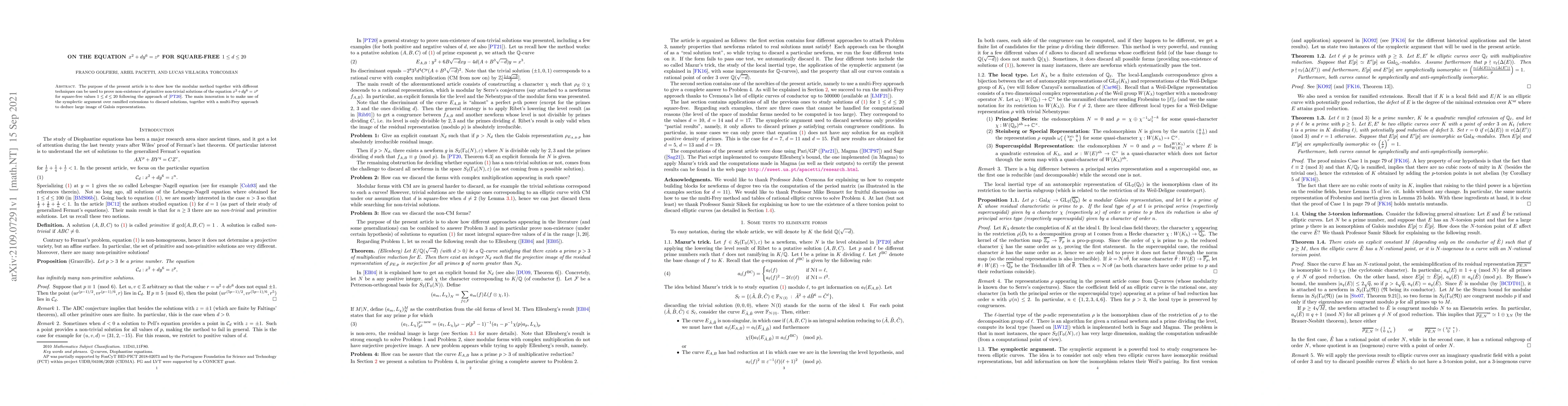 The purpose of the present article is to show how the modular method together with different techniques can be used to prove non-existence of primitive non-trivial solutions of the equation $x^2+dy^6=z^p$ for square-free values $1 \le d \le 20$ following the approach of [PT]. The main innovation is to make use of the symplectic argument over ramified extensions to discard solutions, together with a multi-Frey approach to deduce large image of Galois representations.