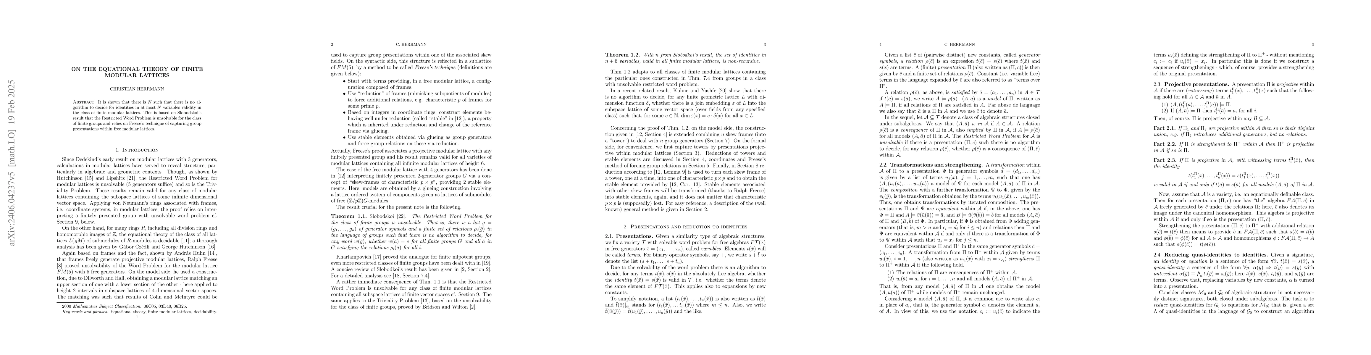 The paper demonstrates the undecidability of the equational theory for finite modular lattices, indicating that there is no algorithm capable of solving all equations within this framework. This result highlights a significant complexity in the algebraic structure of modular lattices.