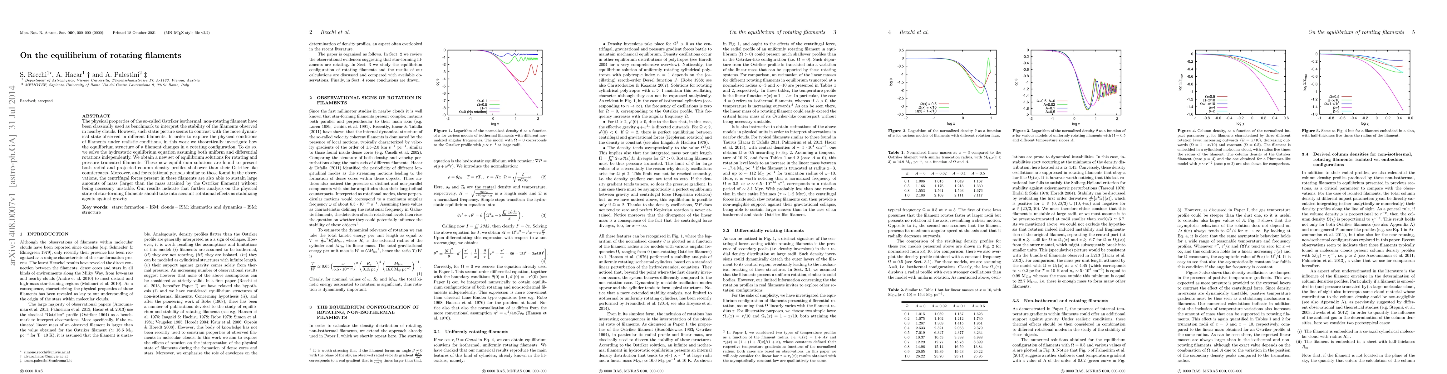 This paper investigates how rotating filaments differ in equilibrium from the traditionally studied non-rotating Ostriker filaments. It finds that rotating configurations can sustain larger masses and have shallower density profiles, suggesting rotational forces act as stabilizing agents.