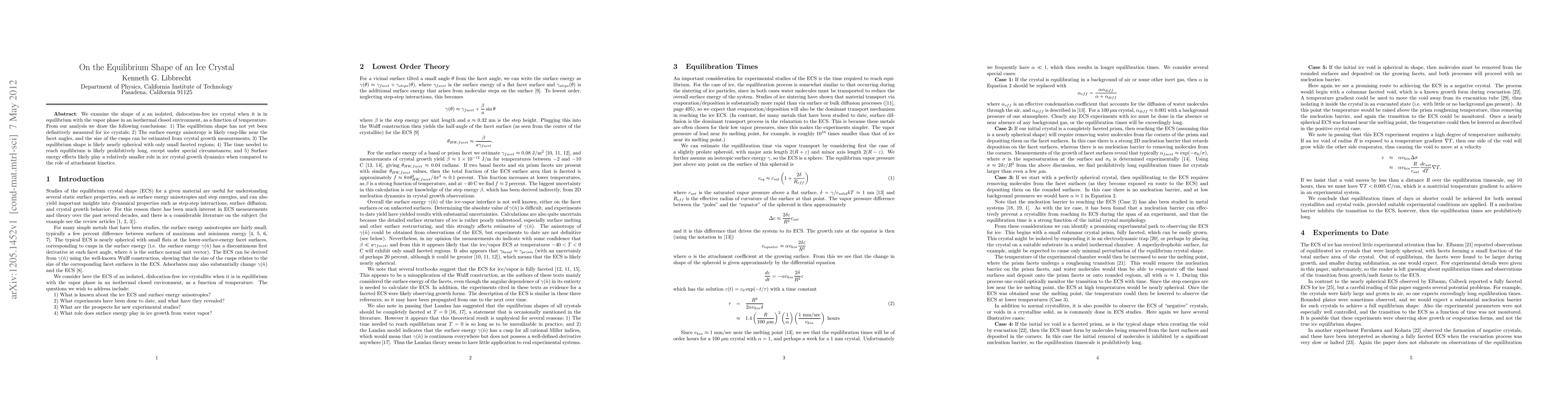 Researchers studied the shape of ice crystals in equilibrium with vapor at various temperatures, concluding that they likely form nearly spherical shapes with small faceted regions, and surface energy effects play a relatively smaller role in growth dynamics than attachment kinetics.