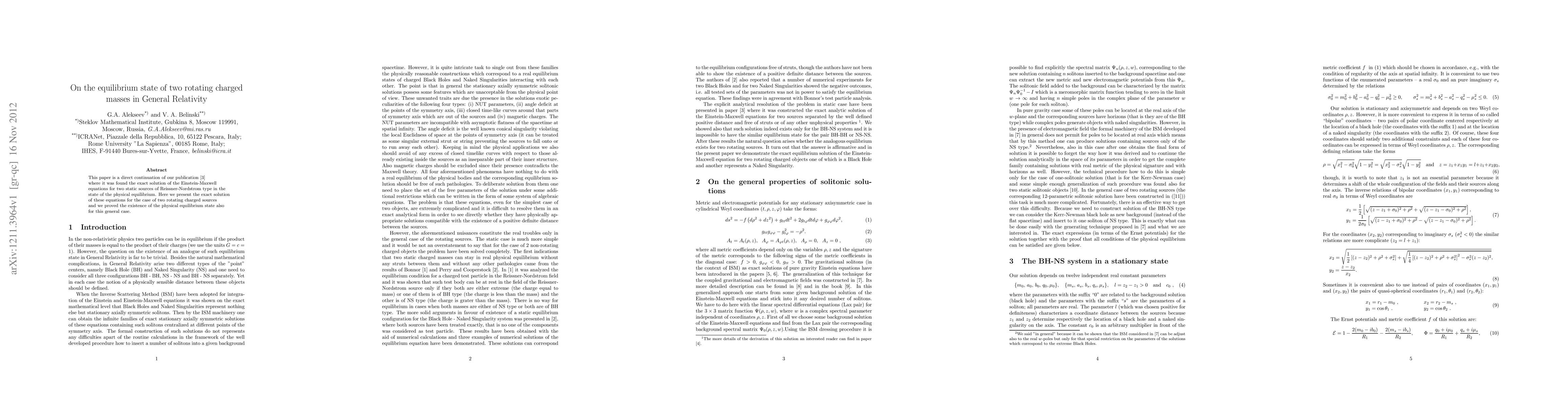 Researchers found an exact solution to Einstein-Maxwell equations for two rotating charged masses in General Relativity, proving the existence of a physical equilibrium state.