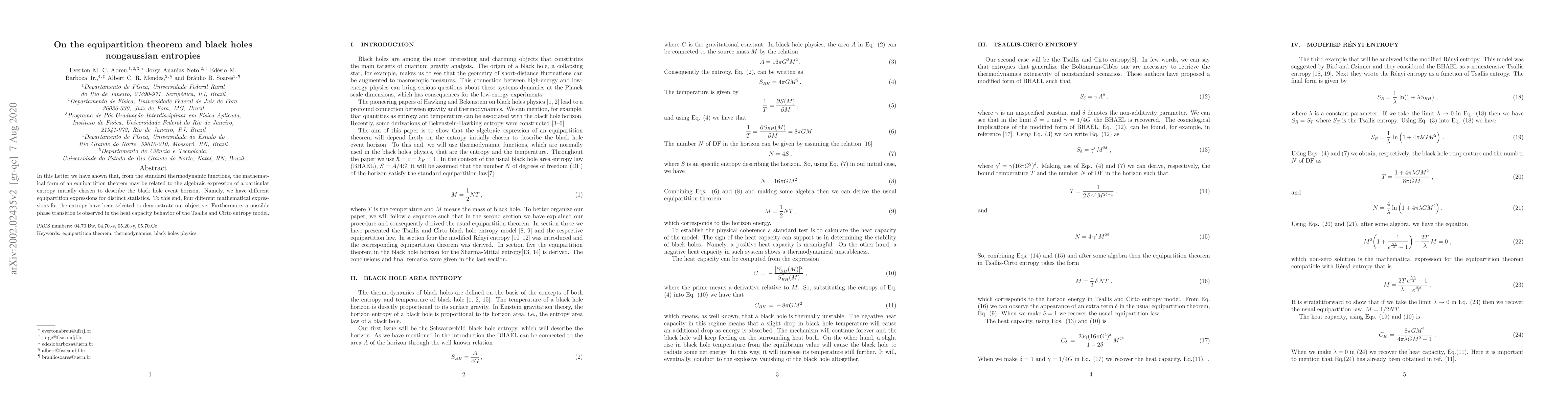 In this Letter we have shown that, from the standard thermodynamic functions, the mathematical form of an equipartition theorem may be related to the algebraic expression of a particular entropy initially chosen to describe the black hole thermodynamics. Namely, we have different equipartition expressions for distinct statistics. To this end, four different mathematical expressions for the entropy have been selected to demonstrate our objective. Furthermore, a possible phase transition is observed in the heat capacity behavior of the Tsallis and Cirto entropy model.