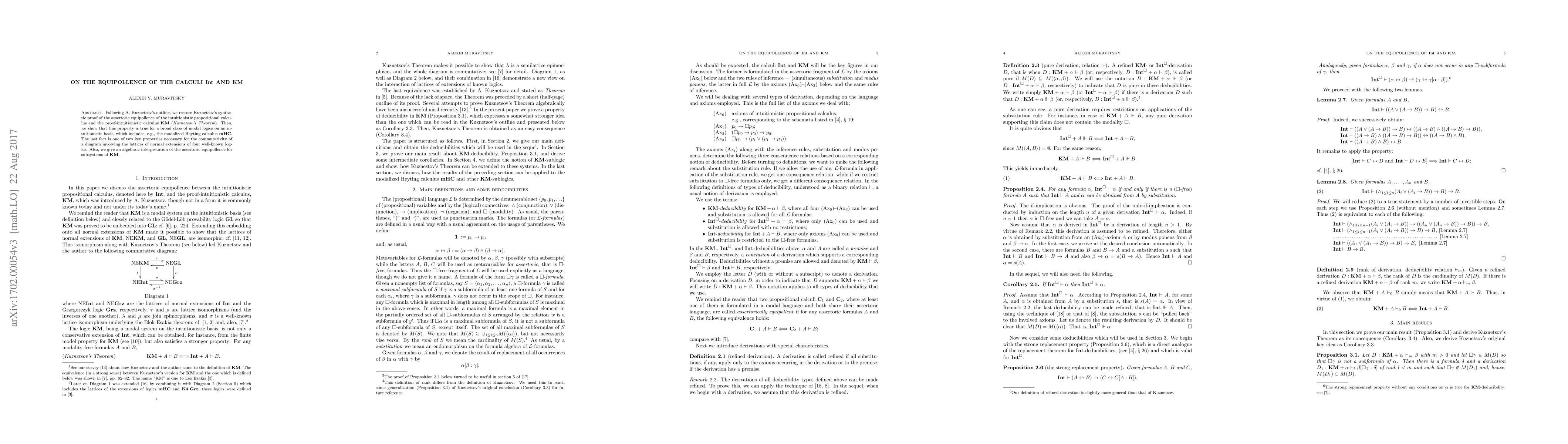 Following A. Kuznetsov's outline, we restore Kuznetsov's syntactic proof of the assertoric equipollence of the intuitionistic propositional calculus and the proof-intuitionistic calculus KM (Kuznetsov's Theorem). Then, we show that this property is true for a broad class of modal logics on an intuitionistic basis, which includes, e.g., the modalized Heyting calculus mHC. The last fact is one of two key properties necessary for the commutativity of a diagram involving the lattices of normal extensions of four well-known logics. Also, we give an algebraic interpretation of the assertoric equipollence for subsystems of KM.