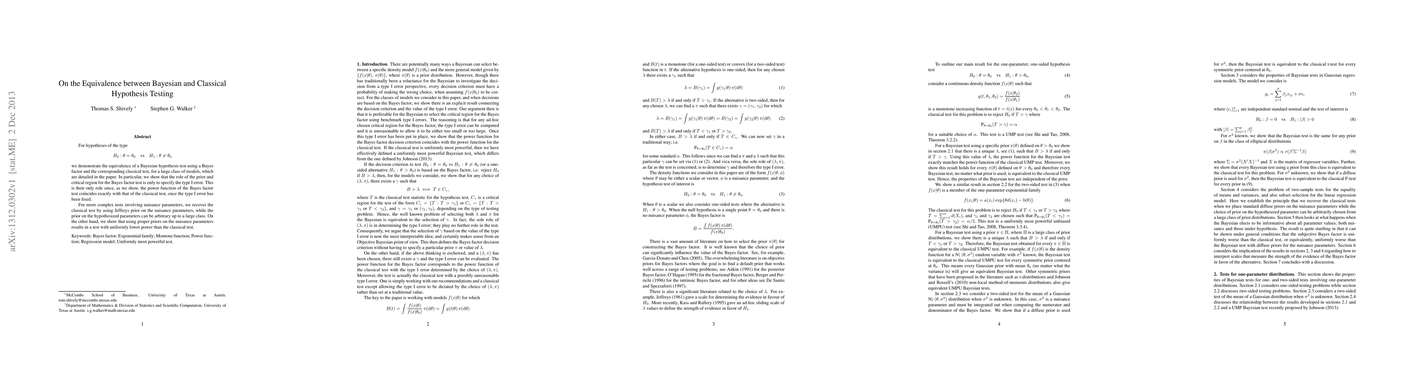For hypotheses of the type H_0:theta=theta_0 vs H_1:theta ne theta_0 we demonstrate the equivalence of a Bayesian hypothesis test using a Bayes factor and the corresponding classical test, for a large class of models, which are detailed in the paper. In particular, we show that the role of the prior and critical region for the Bayes factor test is only to specify the type I error. This is their only role since, as we show, the power function of the Bayes factor test coincides exactly with that of the classical test, once the type I error has been fixed. For more complex tests involving nuisance parameters, we recover the classical test by using Jeffreys prior on the nuisance parameters, while the prior on the hypothesized parameters can be arbitrary up to a large class. On the other hand, we show that using proper priors on the nuisance parameters results in a test with uniformly lower power than the classical test.
