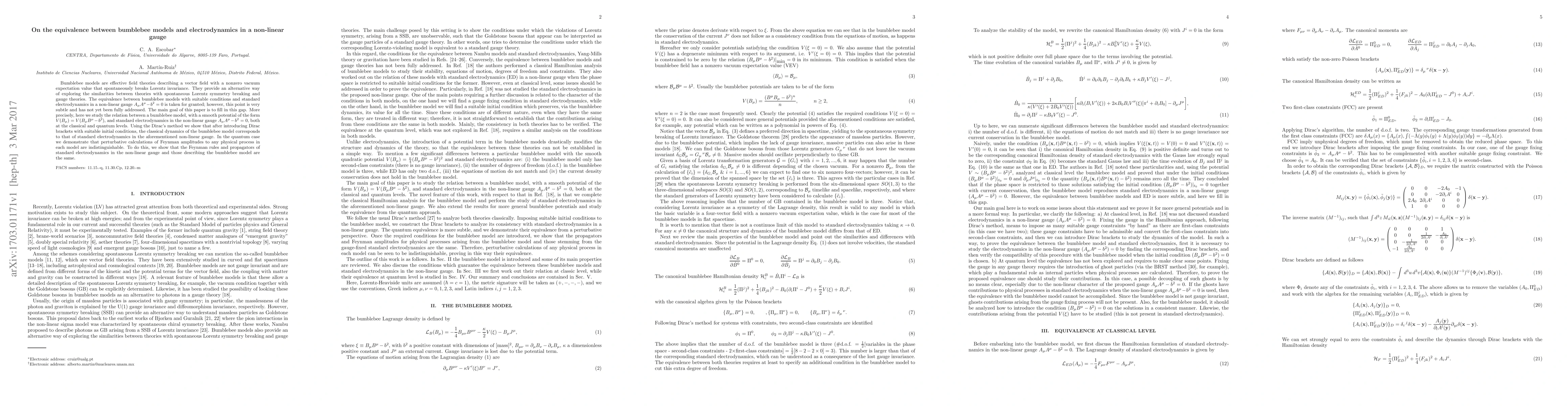 This paper investigates the equivalence between bumblebee models and standard electrodynamics in a non-linear gauge, demonstrating that their classical and quantum dynamics are identical under specific conditions. It uses Dirac brackets to show that the bumblebee model's dynamics match those of electrodynamics in a non-linear gauge, and proves that their Feynman rules and propagators are indistinguishable.