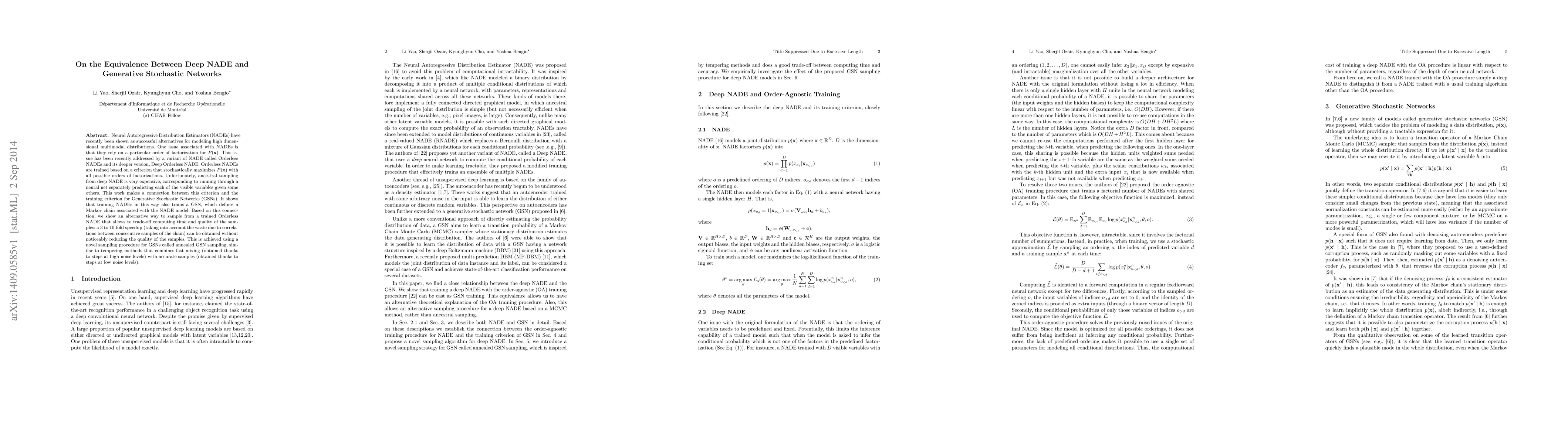 Neural Autoregressive Distribution Estimators (NADEs) have recently been shown as successful alternatives for modeling high dimensional multimodal distributions. One issue associated with NADEs is that they rely on a particular order of factorization for $P(\mathbf{x})$. This issue has been recently addressed by a variant of NADE called Orderless NADEs and its deeper version, Deep Orderless NADE. Orderless NADEs are trained based on a criterion that stochastically maximizes $P(\mathbf{x})$ with all possible orders of factorizations. Unfortunately, ancestral sampling from deep NADE is very expensive, corresponding to running through a neural net separately predicting each of the visible variables given some others. This work makes a connection between this criterion and the training criterion for Generative Stochastic Networks (GSNs). It shows that training NADEs in this way also trains a GSN, which defines a Markov chain associated with the NADE model. Based on this connection, we show an alternative way to sample from a trained Orderless NADE that allows to trade-off computing time and quality of the samples: a 3 to 10-fold speedup (taking into account the waste due to correlations between consecutive samples of the chain) can be obtained without noticeably reducing the quality of the samples. This is achieved using a novel sampling procedure for GSNs called annealed GSN sampling, similar to tempering methods that combines fast mixing (obtained thanks to steps at high noise levels) with accurate samples (obtained thanks to steps at low noise levels).