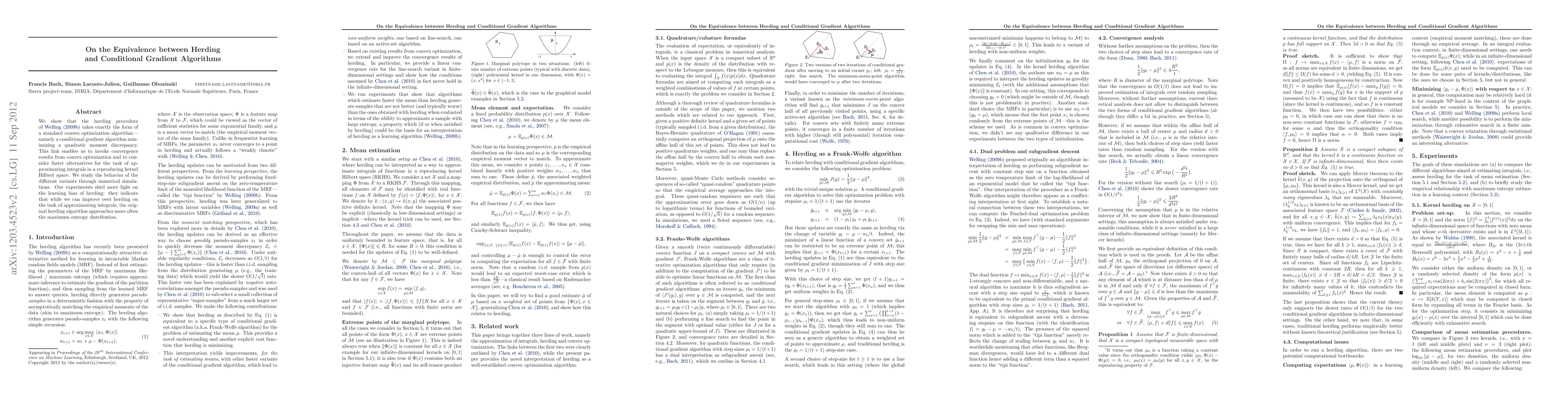 We show that the herding procedure of Welling (2009) takes exactly the form of a standard convex optimization algorithm--namely a conditional gradient algorithm minimizing a quadratic moment discrepancy. This link enables us to invoke convergence results from convex optimization and to consider faster alternatives for the task of approximating integrals in a reproducing kernel Hilbert space. We study the behavior of the different variants through numerical simulations. The experiments indicate that while we can improve over herding on the task of approximating integrals, the original herding algorithm tends to approach more often the maximum entropy distribution, shedding more light on the learning bias behind herding.