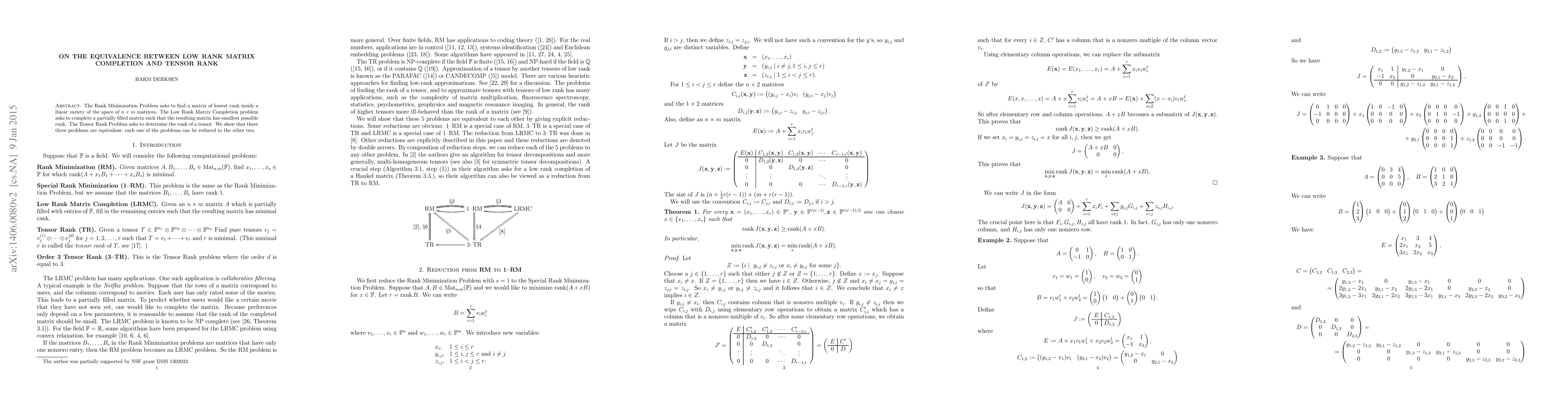 This paper demonstrates the equivalence between low rank matrix completion, the rank minimization problem, and the tensor rank problem, showing that each problem can be reduced to the other two.