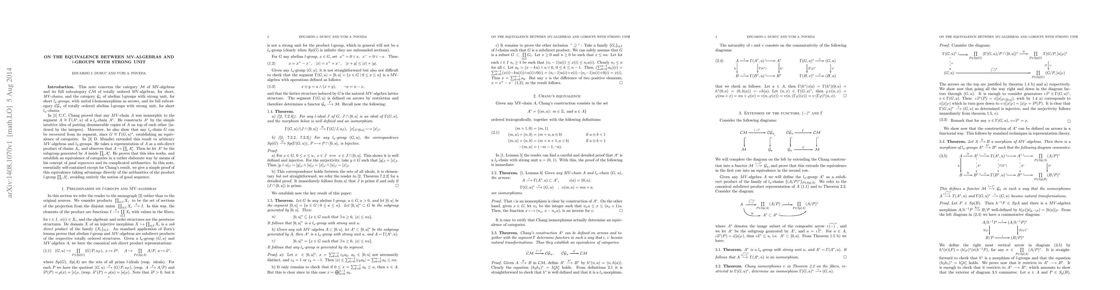 The paper establishes an equivalence between MV-algebras and l-groups with strong unit, showing that any MV-algebra can be represented as a segment of a related l-group and vice versa.