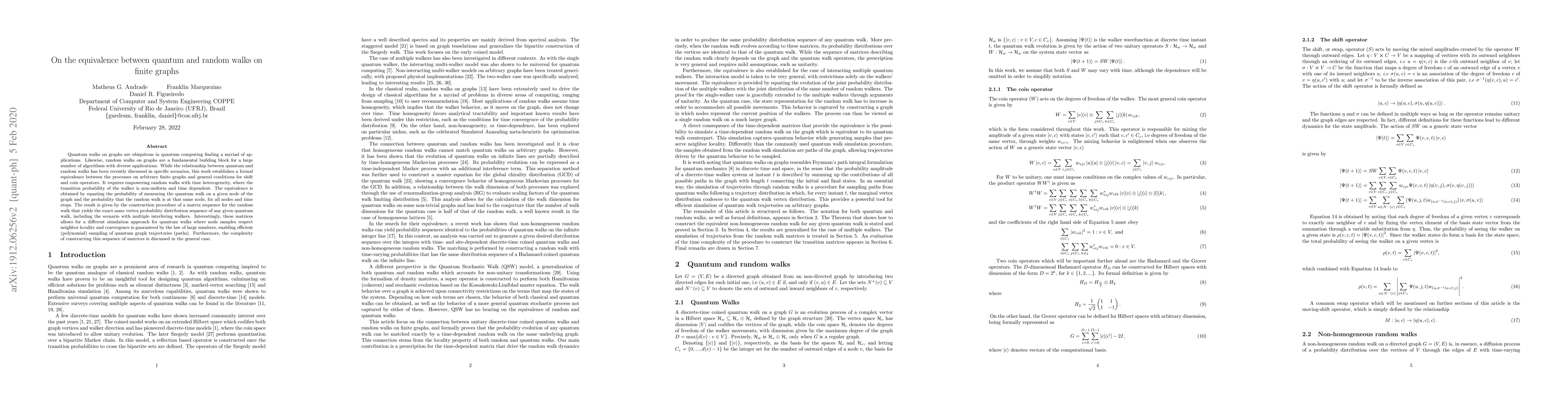 This paper establishes a formal equivalence between quantum and random walks on finite graphs, showing that random walks with time-dependent, non-uniform transition probabilities can simulate quantum walks exactly. The study provides a matrix sequence for random walks that replicates the vertex probability distribution of quantum walks, enabling efficient sampling of quantum graph trajectories.