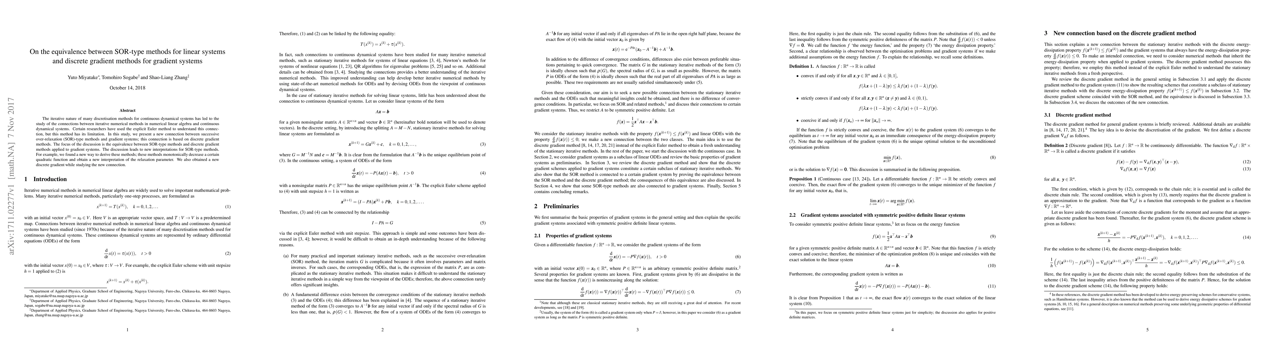 This paper establishes an equivalence between SOR-type methods for solving linear systems and discrete gradient methods for gradient systems, revealing new interpretations and derivations of SOR methods through their connection to gradient dynamics.