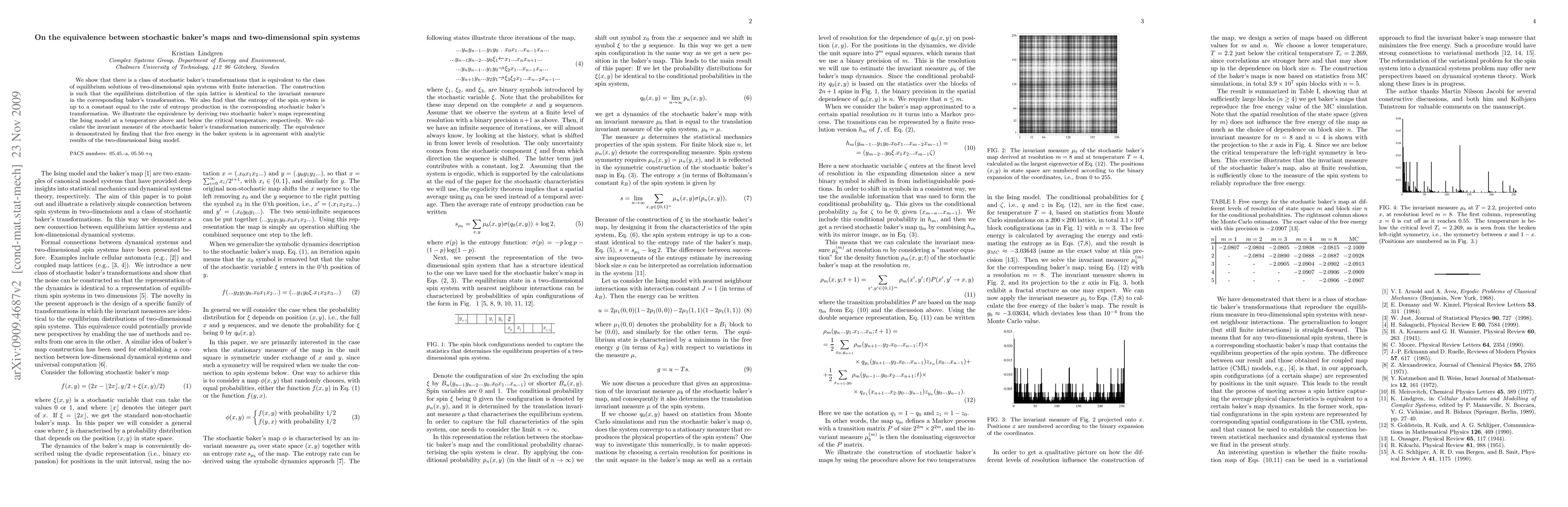 This paper establishes an equivalence between stochastic baker's transformations and two-dimensional spin systems, showing that the equilibrium distribution of the spin lattice matches the invariant measure of the baker's transformation. The entropy of the spin system is shown to be proportional to the rate of entropy production in the corresponding baker's transformation.