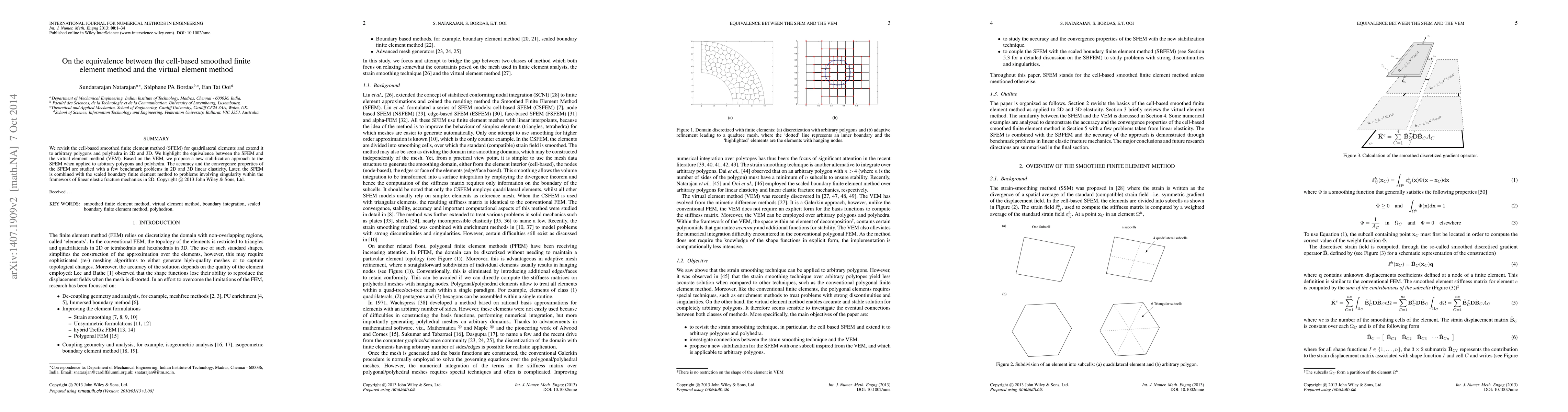 This paper explores the equivalence between the cell-based smoothed finite element method (SFEM) and the virtual element method (VEM), extending SFEM to arbitrary polygons and polyhedrons. It proposes a new stabilization approach for SFEM and investigates its accuracy and convergence properties through benchmark problems in linear elasticity and fracture mechanics.