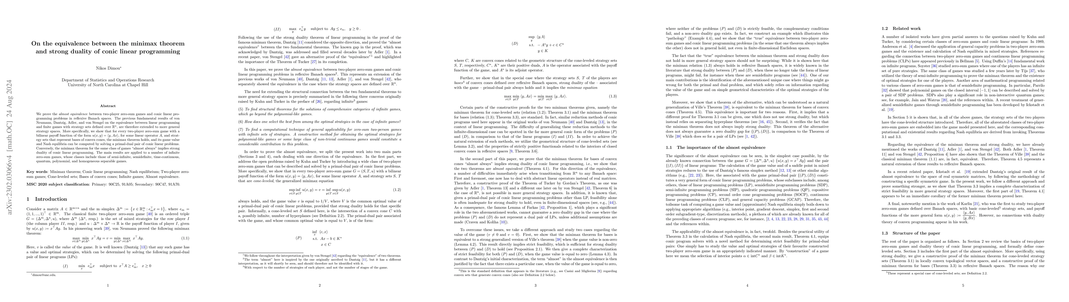 This paper generalizes the equivalence between the minimax theorem and linear programming to the infinite-dimensional setting of conic linear programming in reflexive Banach spaces, showing that two-player zero-sum games with bilinear functions can be solved through conic linear programs, and vice versa.