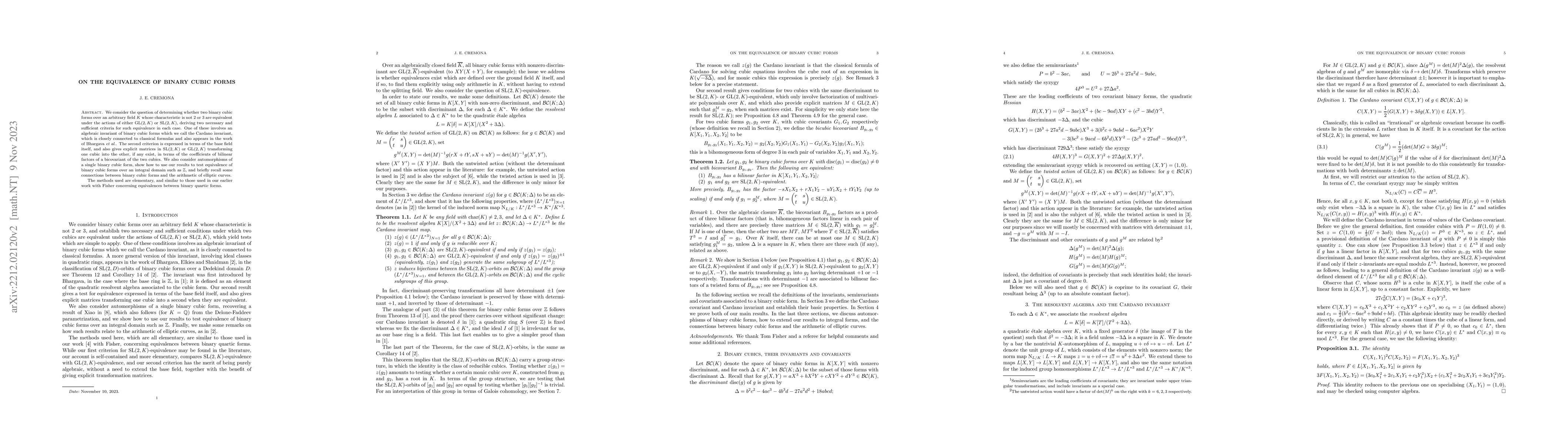 This paper derives criteria for determining the equivalence of binary cubic forms over a field $K$ under GL$(2,K)$ or SL$(2,K)$, introducing a new algebraic invariant, the Cardano invariant, and matrices for transformations, extending methods from binary quartic forms. It also explores automorphisms and connections to elliptic curves.