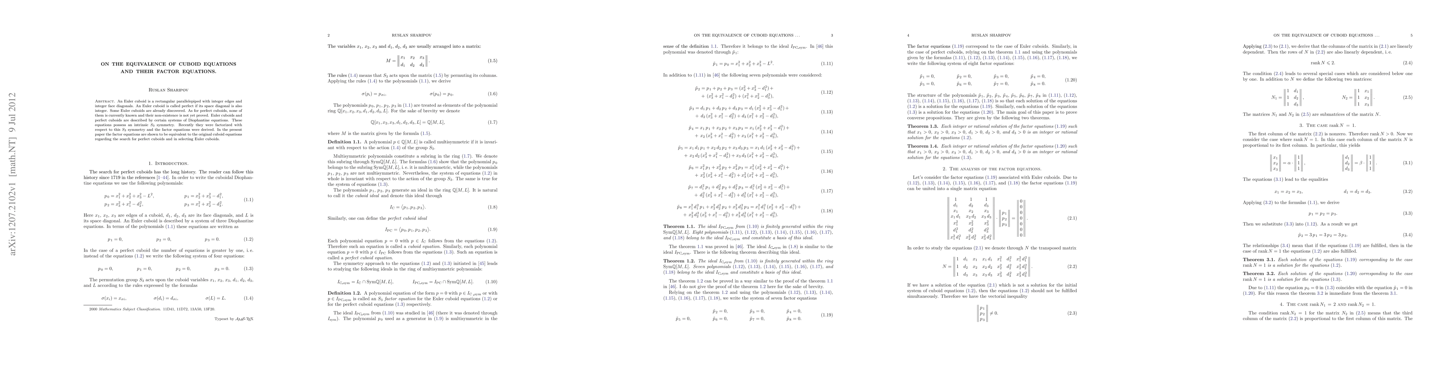 An Euler cuboid is a rectangular parallelepiped with integer edges and integer face diagonals. An Euler cuboid is called perfect if its space diagonal is also integer. Some Euler cuboids are already discovered. As for perfect cuboids, none of them is currently known and their non-existence is not yet proved. Euler cuboids and perfect cuboids are described by certain systems of Diophantine equations. These equations possess an intrinsic $S_3$ symmetry. Recently they were factorized with respect to this $S_3$ symmetry and the factor equations were derived. In the present paper the factor equations are shown to be equivalent to the original cuboid equations regarding the search for perfect cuboids and in selecting Euler cuboids.