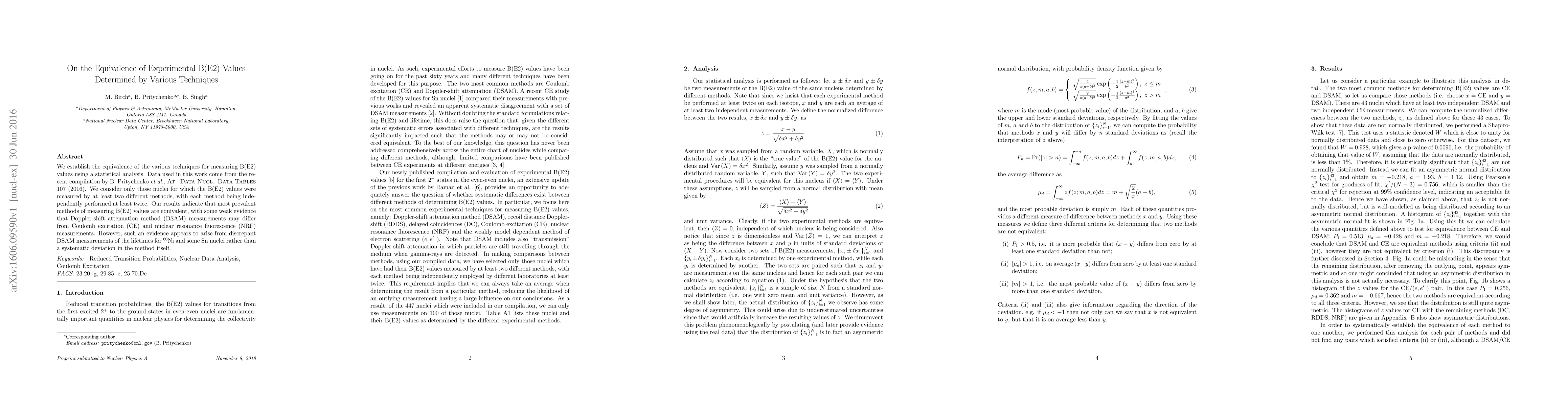 We establish the equivalence of the various techniques for measuring B(E2) values using a statistical analysis. Data used in this work come from the re- cent compilation by B. Pritychenko et al., At. Data Nucl. Data Tables 107 (2016). We consider only those nuclei for which the B(E2) values were measured by at least two different methods, with each method being independently performed at least twice. Our results indicate that most prevalent methods of measuring B(E2) values are equivalent, with some weak evidence that Doppler-shift attenuation method (DSAM) measurements may differ from Coulomb excitation (CE) and nuclear resonance fuorescence (NRF) measurements. However, such an evidence appears to arise from discrepant DSAM measurements of the lifetimes for 60Ni and some Sn nuclei rather than a systematic deviation in the method itself.