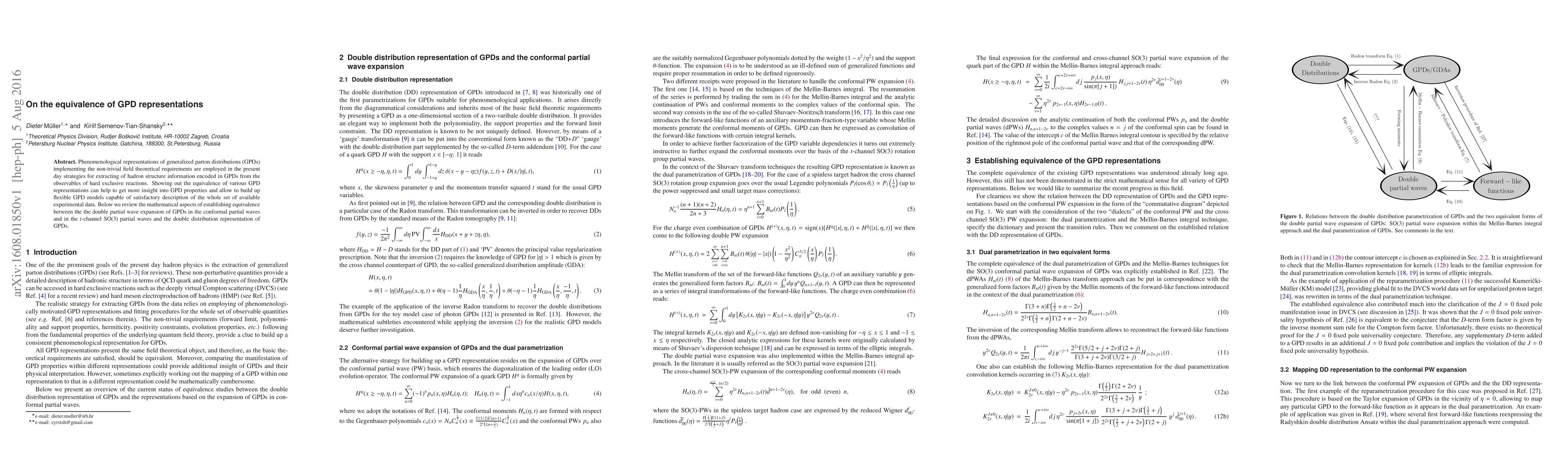 Phenomenological representations of generalized parton distributions (GPDs) implementing the non-trivial field theoretical requirements are employed in the present day strategies for extracting of hadron structure information encoded in GPDs from the observables of hard exclusive reactions. Showing out the equivalence of various GPD representations can help to get more insight into GPD properties and allow to build up flexible GPD models capable of satisfactory description of the whole set of available experimental data. We review the mathematical aspects of establishing equivalence between the the double partial wave expansion of GPDs in the conformal partial waves and in the $t$-channel ${\rm SO}(3)$ partial waves and the double distribution representation of GPDs.