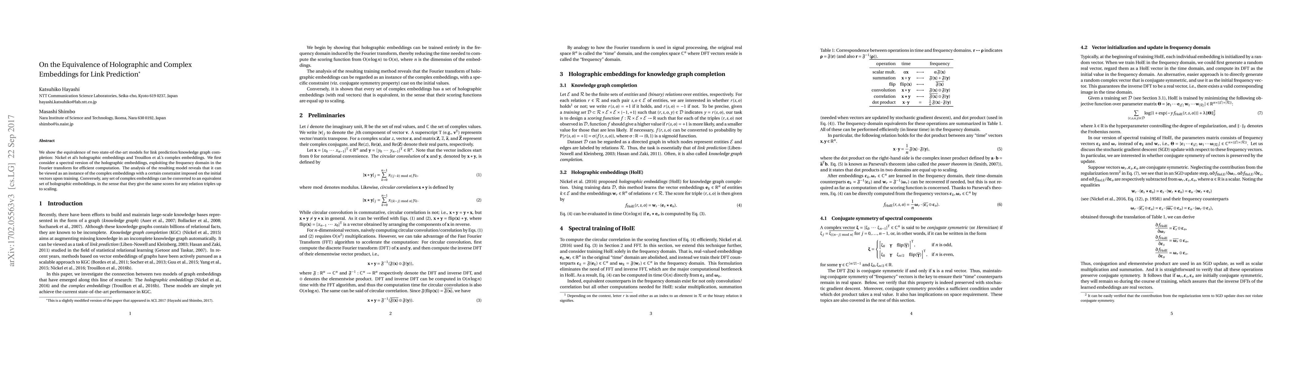 This paper demonstrates the equivalence between Nickel et al.'s holographic embedding and Trouillon et al.'s complex embedding for link prediction, showing that both methods can be transformed into each other under certain constraints. The study also introduces a spectral version of the holographic embedding for efficient computation.