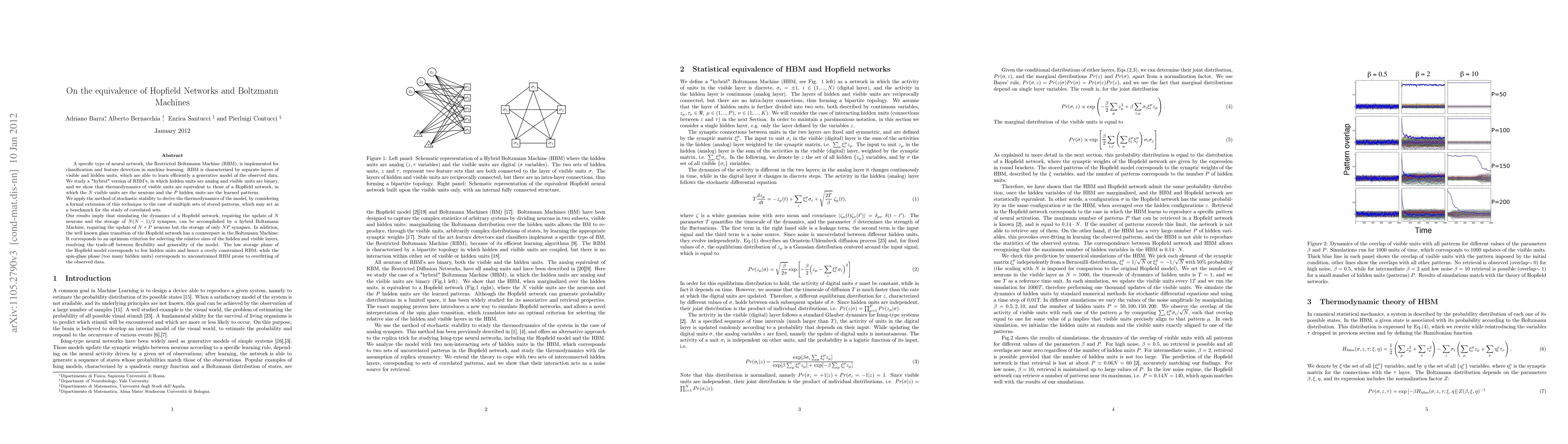 This paper explores the equivalence between Hopfield Networks and a hybrid version of Restricted Boltzmann Machines (RBMs), demonstrating that the thermodynamics of visible units in the hybrid RBM mirrors that of Hopfield networks. The study finds that a hybrid RBM can simulate Hopfield networks with reduced storage requirements, and identifies an optimal balance in the size of hidden and visible layers to avoid overfitting.