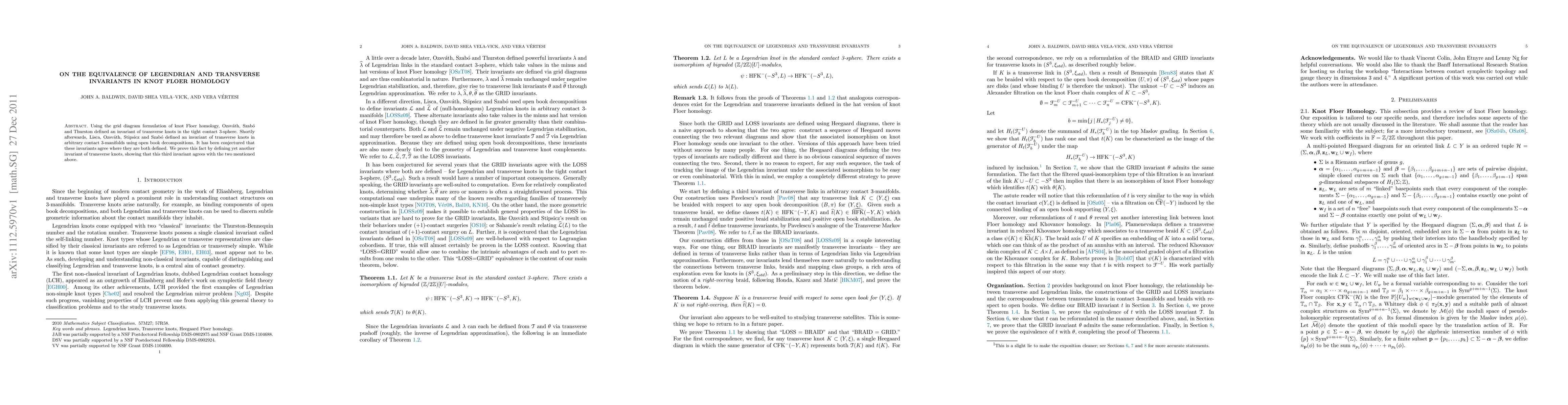 Using the grid diagram formulation of knot Floer homology, Ozsvath, Szabo and Thurston defined an invariant of transverse knots in the tight contact 3-sphere. Shortly afterwards, Lisca, Ozsvath, Stipsicz and Szabo defined an invariant of transverse knots in arbitrary contact 3-manifolds using open book decompositions. It has been conjectured that these invariants agree where they are both defined. We prove this fact by defining yet another invariant of transverse knots, showing that this third invariant agrees with the two mentioned above.