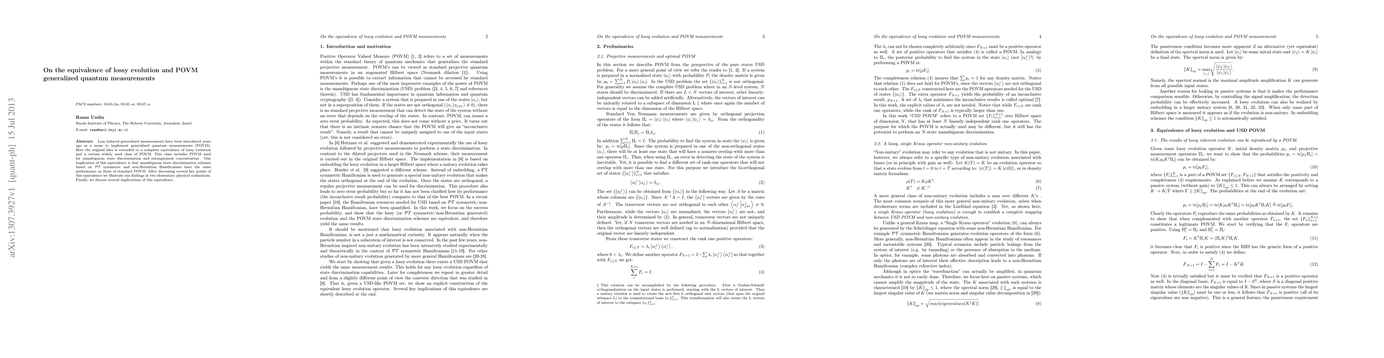 This paper establishes a complete equivalence between lossy evolution and a specific class of POVM measurements, including those used for unambiguous state discrimination and entanglement concentration. The findings suggest that PT-symmetric and non-Hermitian Hamiltonians perform equally well in unambiguous state discrimination compared to standard POVM.