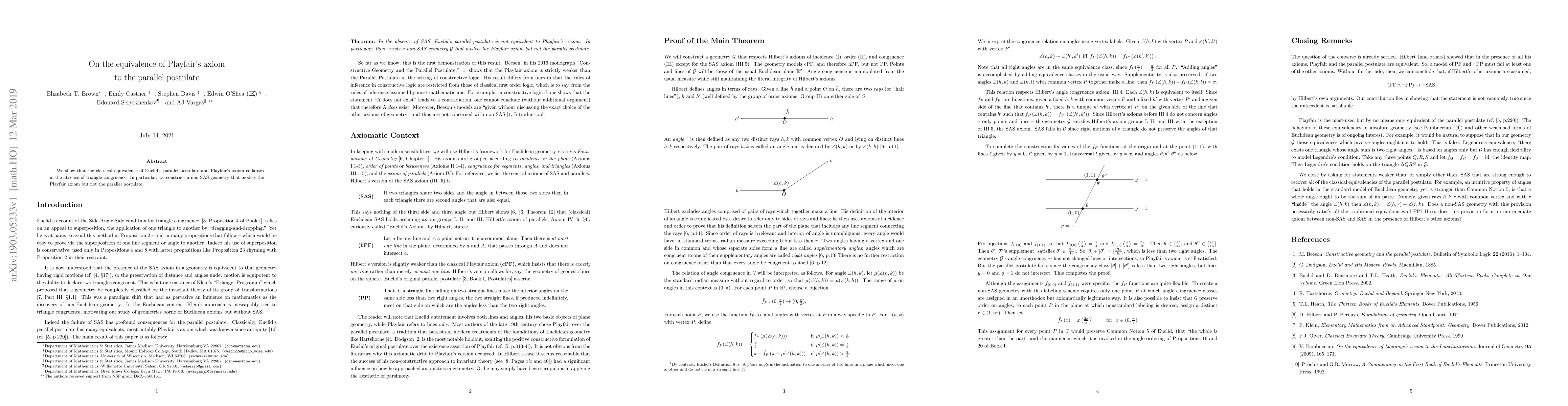 We show that the classical equivalence of Euclid's parallel postulate and Playfair's axiom collapses in the absence of triangle congruence. In particular, we construct a non-SAS geometry that models the Playfair axiom but not the parallel postulate.