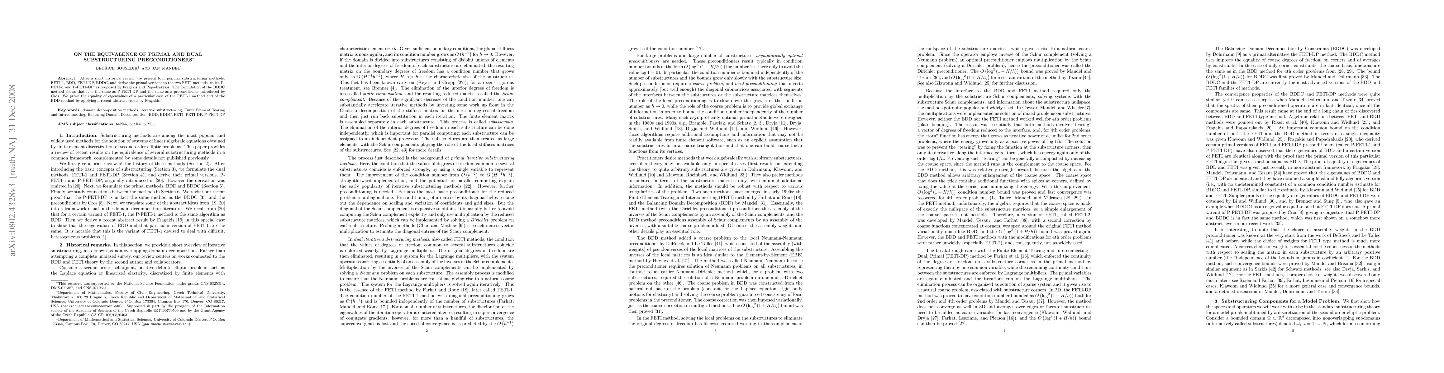 Researchers equate primal and dual substructuring preconditioners for efficient matrix computations in finite element methods, offering a simplified approach to complex calculations.