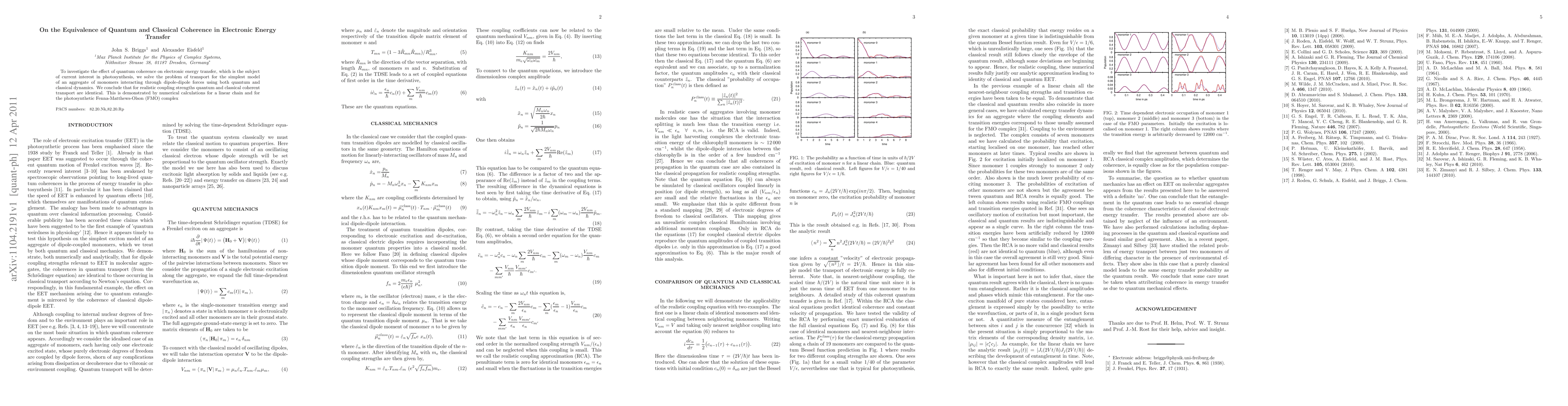 To investigate the effect of quantum coherence on electronic energy transfer, which is the subject of current interest in photosynthesis, we solve the problem of transport for the simplest model of an aggregate of monomers interacting through dipole-dipole forces using both quantum and classical dynamics. We conclude that for realistic coupling strengths quantum and classical coherent transport are identical. This is demonstrated by numerical calculations for a linear chain and for the photosynthetic Fenna-Matthews-Olson (FMO) complex