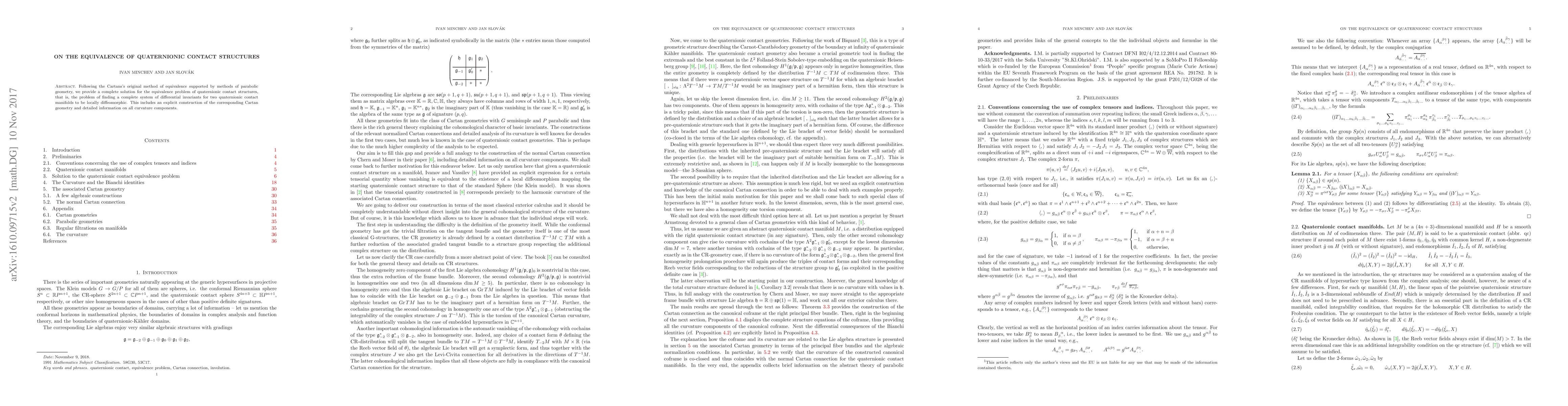 This paper presents a comprehensive solution to the equivalence problem of quaternionic contact structures using Cartan's method and parabolic geometry, providing a complete system of differential invariants and an explicit construction of Cartan geometry with detailed curvature information.