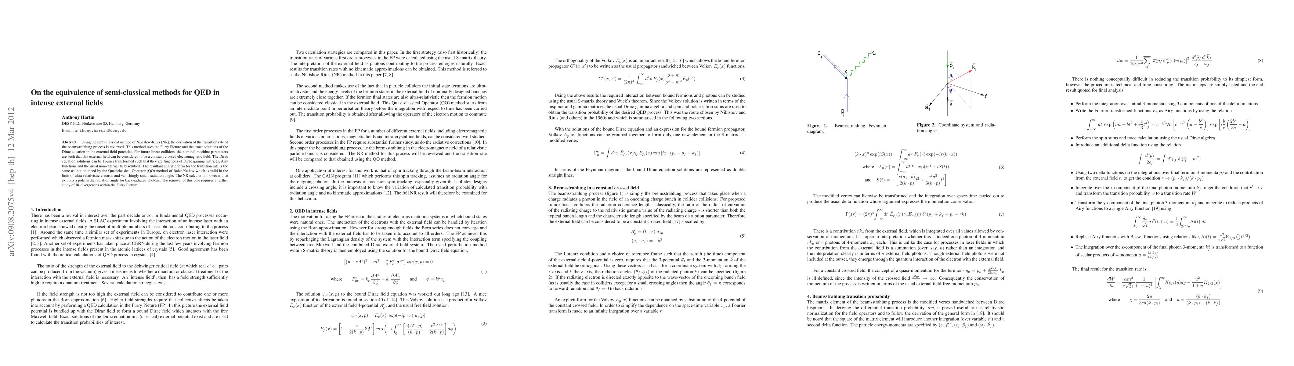 Using the semi-classical method of Nikishov-Ritus (NR), the derivation of the transition rate of the beamstrahlung process is reviewed. This method uses the Bound Interaction Picture and the exact solutions of the Dirac equation in the external field potential. For future linear colliders, the nominal machine parameters are such that this external field can be considered to be a constant crossed electromagnetic field. The Dirac equation solutions can be Fourier transformed such that they are functions of Dirac gamma matrices, Airy functions and the usual non-external field solution. The resultant analytic form for the transition rate is the same as that obtained by the Quasiclassical Operator (QO) method of Baier-Katkov which sets a limit of ultra-relativistic electron and vanishingly small radiation angle. The NR calculation however also exhibits a pole in the radiation angle for back-radiated photons. The removal of this pole requires a further study of IR divergences within the Bound Interaction Picture.