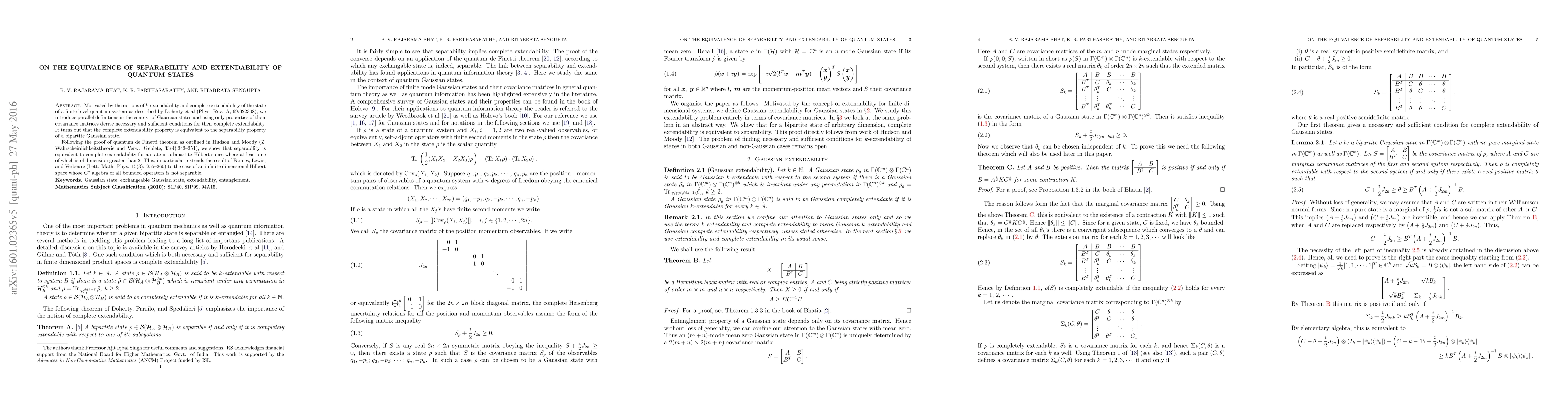 This paper establishes the equivalence between the separability and complete extendability of bipartite Gaussian quantum states, using properties of their covariance matrices. It extends the quantum de Finetti theorem to infinite-dimensional Hilbert spaces, showing that separability implies complete extendability when at least one subsystem is of dimension greater than 2.