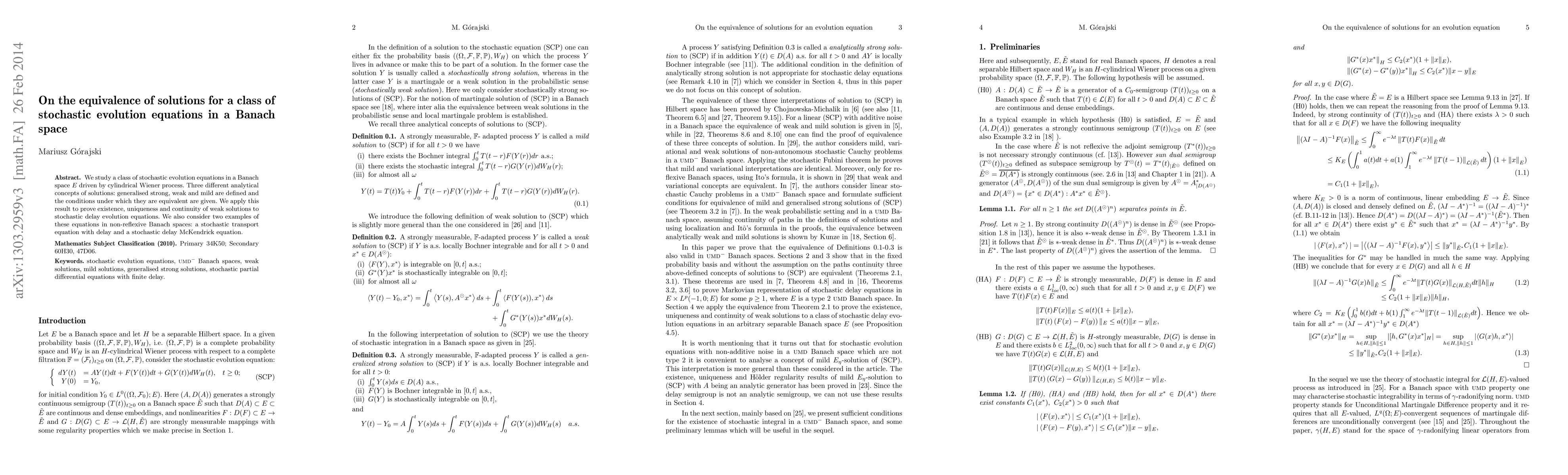 This paper investigates the equivalence of generalized strong, weak, and mild solutions for stochastic evolution equations in Banach spaces driven by a cylindrical Wiener process. It establishes the conditions under which these solution concepts are equivalent and applies these results to prove the existence, uniqueness, and continuity of weak solutions for stochastic delay equations with additive noise, including two examples in non-reflexive Banach spaces.