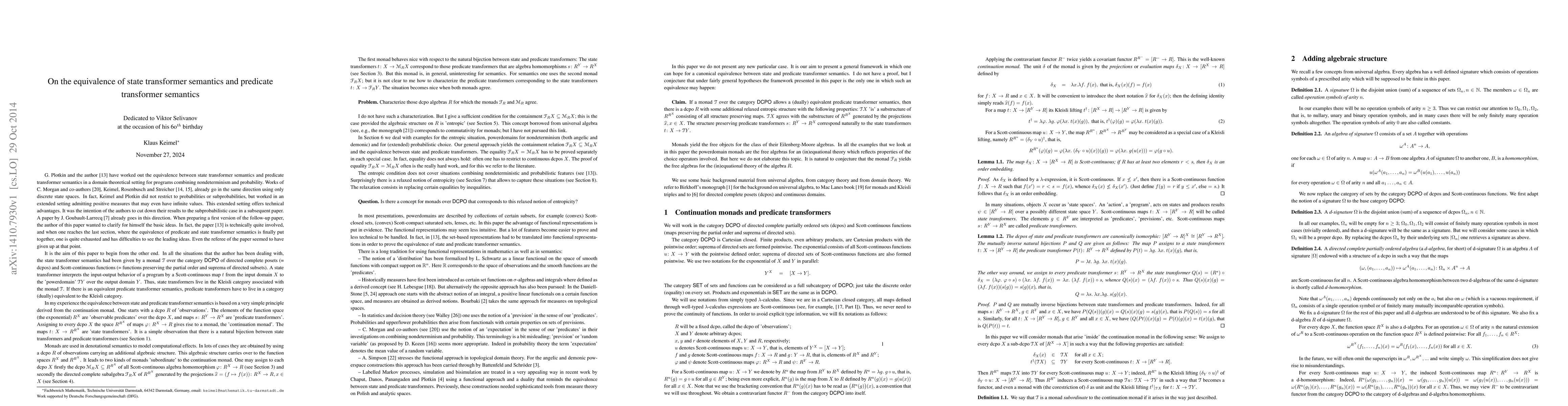 The paper establishes the equivalence between state transformer semantics and predicate transformer semantics in a domain-theoretic setting, incorporating nondeterminism and probability. It builds upon previous works by Morgan and others, extending the framework to continuous domains.