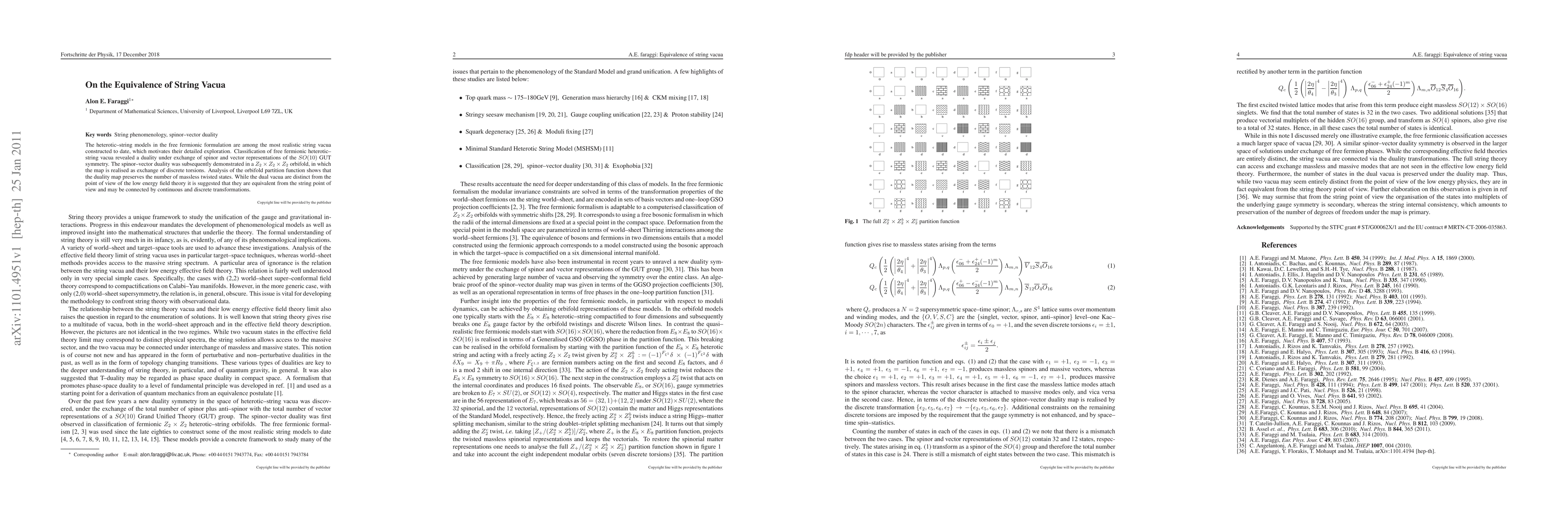 The heterotic-string models in the free fermionic formulation are among the most realistic string vacua constructed to date, which motivates their detailed exploration. Classification of free fermionic heterotic-string vacua revealed a duality under exchange of spinor and vector representations of the SO(10) GUT symmetry. The spinor-vector duality was subsequently demonstrated in a Z2 X Z2 X Z2 orbifold, in which the map is realised as exchange of discrete torsions. Analysis of the orbifold partition function shows that the duality map preserves the number of massless twisted states. While the dual vacua are distinct from the point of view of the low energy field theory it is suggested that they are equivalent from the string point of view and may be connected by continuous and discrete transformations.