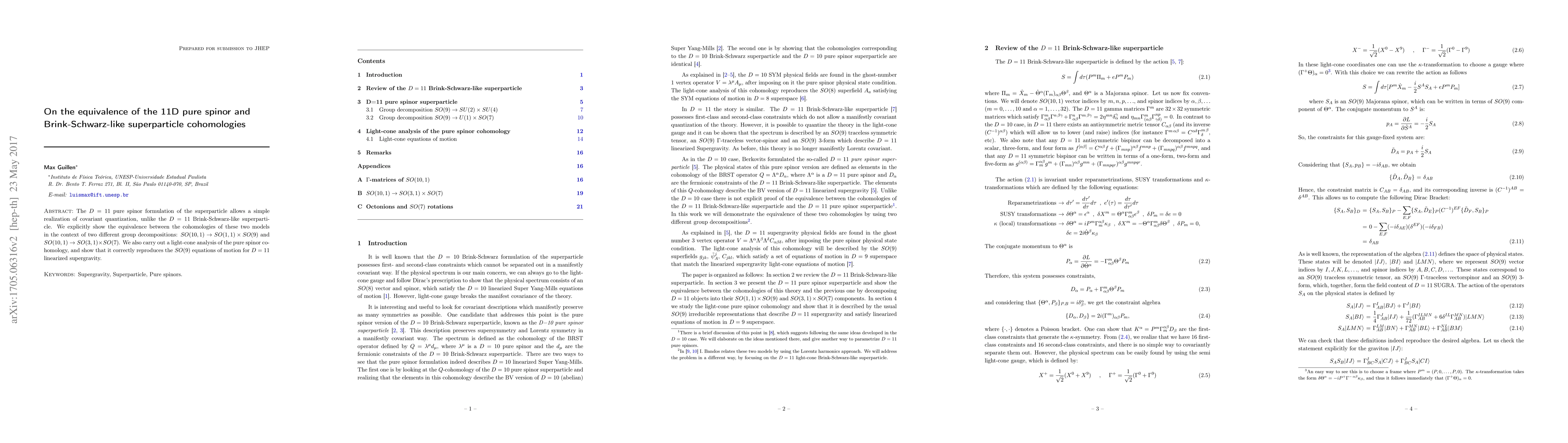 This paper demonstrates the equivalence between the cohomologies of the $D=11$ pure spinor and Brink-Schwarz-like superparticles through two group decompositions. It also verifies that the pure spinor cohomology reproduces the linearized supergravity equations of motion.