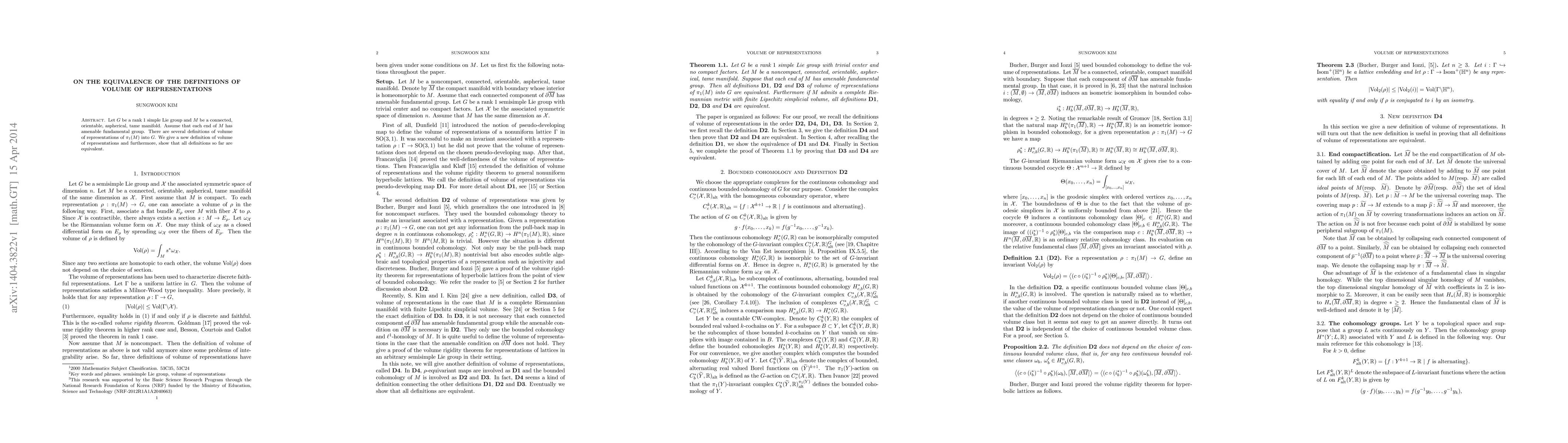 Let G be a rank 1 simple Lie group and M be a connected orientable aspherical tame manifold. Assume that each end of M has amenable fundamental group. There are several definitions of volume of representations of the fundamental group of M into G. We give a new definition of volume of representations and furthermore, show that all definitions so far are equivalent.